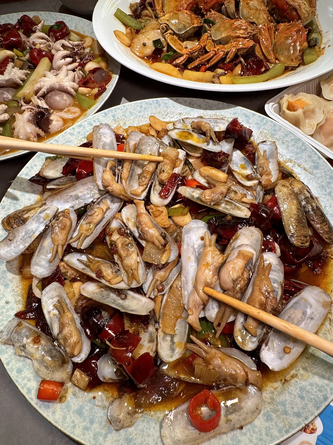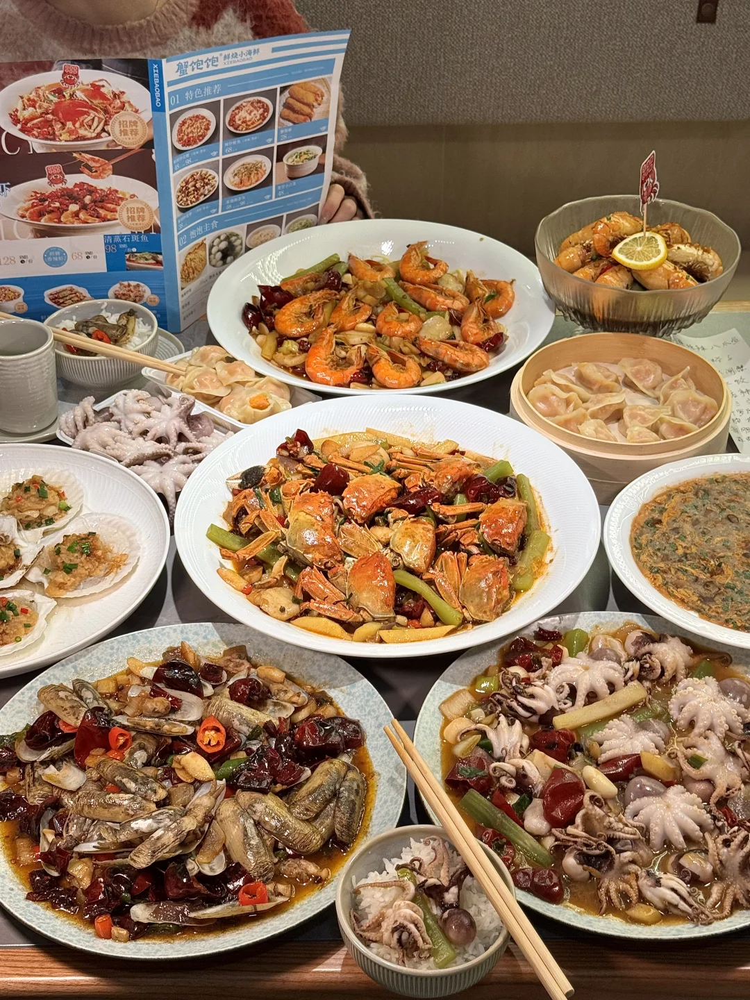辣炒八爪鱼!!上桌香气就扑我一脸!整只八爪鱼入口q弹充满嚼劲 和朋友吃完一盘又下了两份! 就在城北花园城!叫:蟹饱饱📍)不愧是七欣天旗下品牌~份量大口味好!海鲜鲜活现捞!盲点不踩雷:鲜烧香辣蛏子、香辣大闸蟹、捞汁罗氏虾…鲜辣入味好好吃! 还有海胆水饺 内馅饱满吃完满嘴鲜甜!海肠捞饭、三文鱼、蒜蓉粉丝紫贝……满满一桌都不错! 已列为我和朋友会反复n刷的小店!!