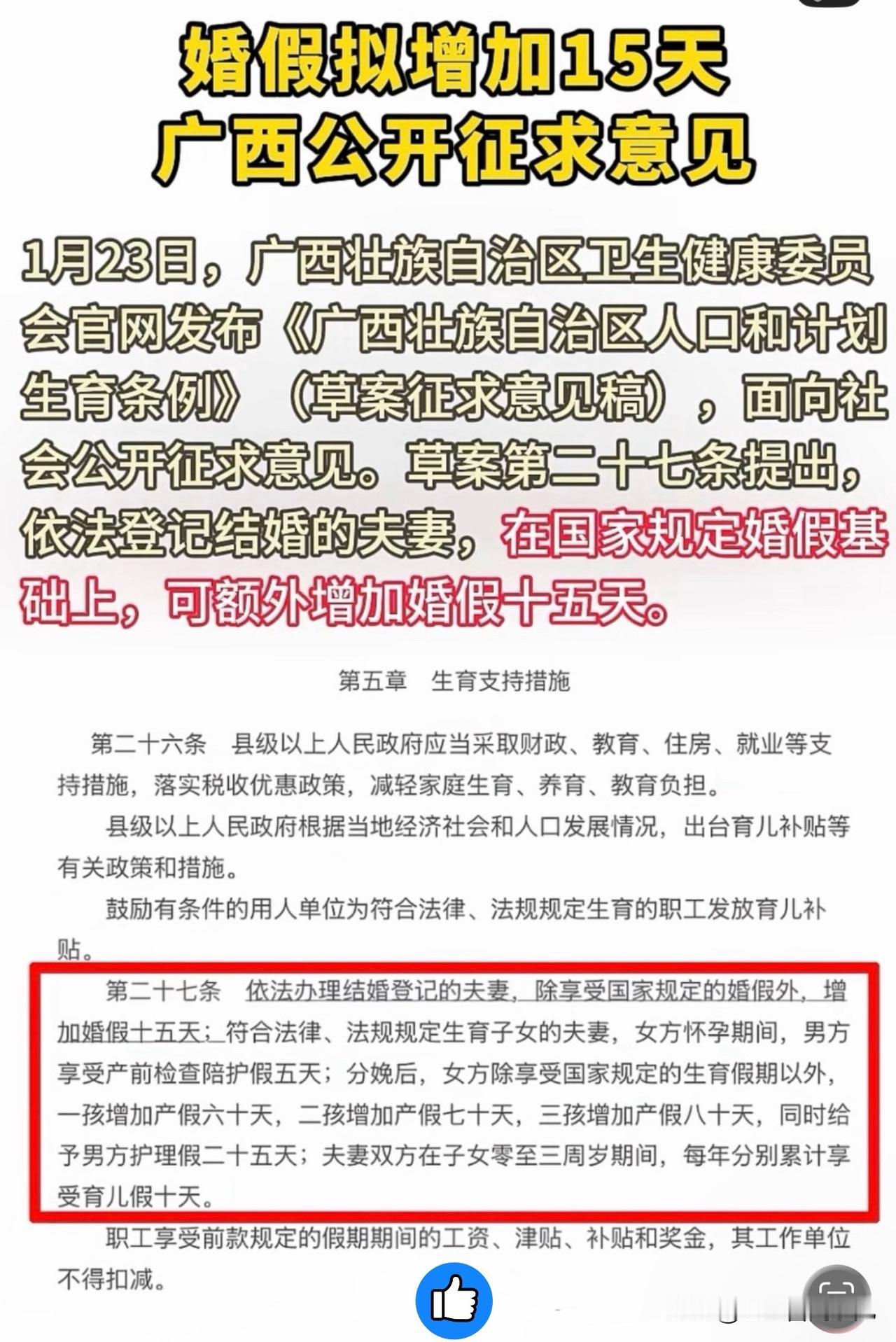 喜讯!广西人的婚假有望“超级加倍”! 1月23日,广西卫健委正式“放大招”,发布了《广西壮族自治区人口和计划生育条例》(草案征求意见稿),明确提出要在国家婚假基础上,再增加足足15天假期! 这波算是官方下场“催婚”吧?眼看快过年给广大单身朋友提个醒! 以前催婚是年纪不小了,以后催婚可能是快结婚吧,多划算啊,能白捡半个月带薪假呢! 玩笑归玩笑,延长婚假的好处是实实在在的:新人们可以有更充足的时间操办婚礼、享受甜蜜的二人世界,甚至来一场说走就走的旅行…… 这假能安心休吗?草案明确写了:职工休这个假,工资、津贴、补贴和奖金,单位都不能扣。参加了生育保险的,产假津贴也有保障。 目前是征求意见期间,说出你的想法![大金牙] 南宁身边事 结婚 打工人