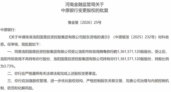 近日,国家金融监督管理总局河南金融监管局发布批复,核准洛阳国晟投资控股集团有限公司股东资格,同意洛阳国晟受让洛阳市财政局持有中原银行的13.62亿股股份。受让后,洛阳市财政局不再持有中原银行股份,洛阳国晟投资控股集团持有中原银行13.62亿股股份,持股比例为3.73%。
