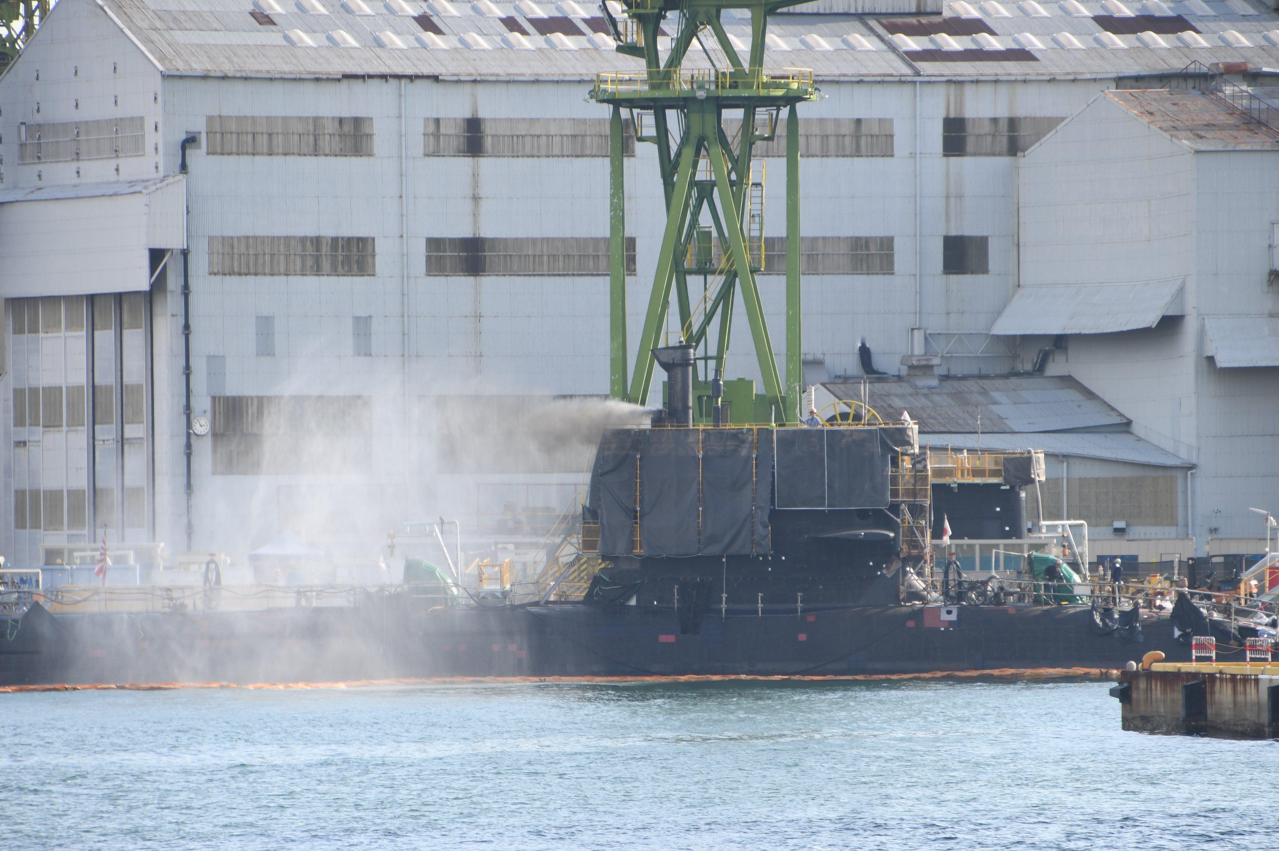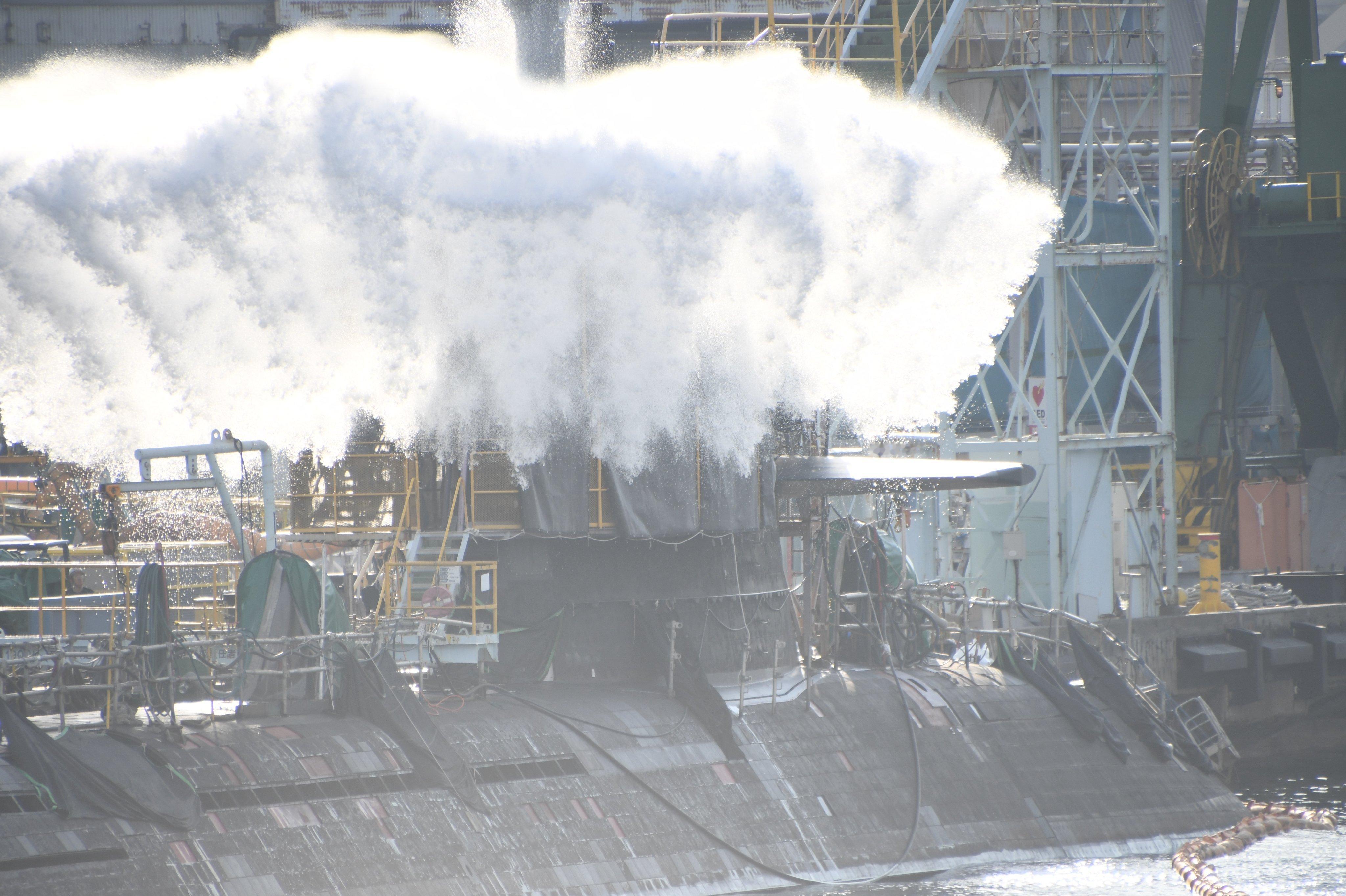 苍龙和大鲸的进排气一体通气管测试画面!小海豚以前说过常规艇水下进排气相关内容,提到过正常是围壳上的通气管进气,围壳后部设置排气管,鬼子比较特别,他这管子跟燃气壁挂炉一样,进排气在一个结构里,高处是进气,低处是排气,还可以看着网页链接中外舰闻