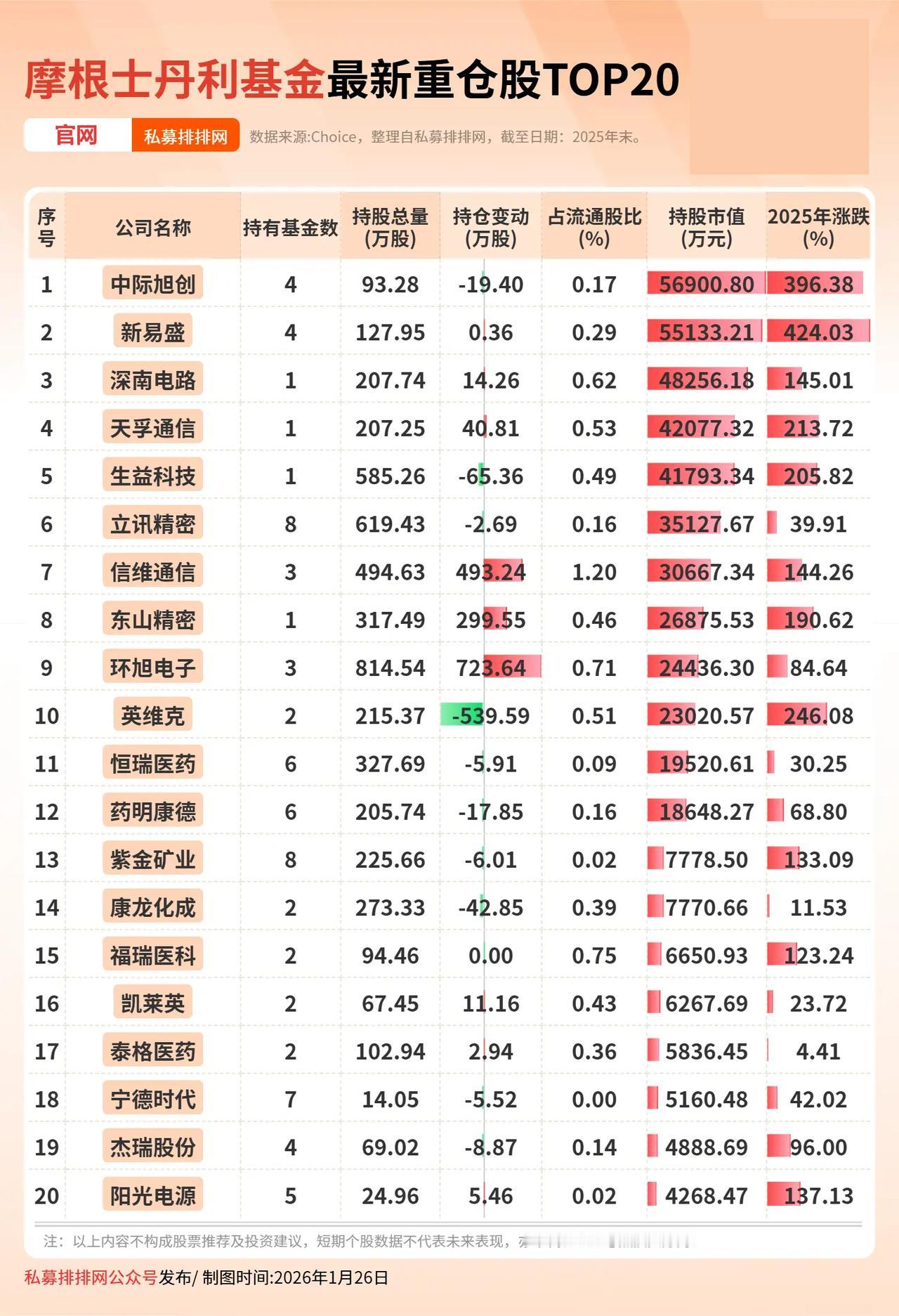 摩根士丹利持仓一览表最新(2025年四季度) (向右滑动图片查看完整名单) 摩根士丹利(俗称“大摩”)来自美国纽约,是一家跨国投资银行与金融服务公司。 摩根士丹利买入股票,往往代表对该公司投资价值与发展前景的认可,通常被市场视为积极信号。 摩根士丹利持仓明细 私募排排网大佬持仓数据显示,截至2025年四季度末,摩根士丹利基金资产规模达263.30亿元,旗下基金持有161只标的,股票市值约为111.54亿元。 从行业来看,2025年四季度末,摩根士丹利基金重仓股所属行业主要集中在AI方向。 从涨跌幅来看,前二十大重仓股市场表现较为亮眼,涨幅均值达138.03%。