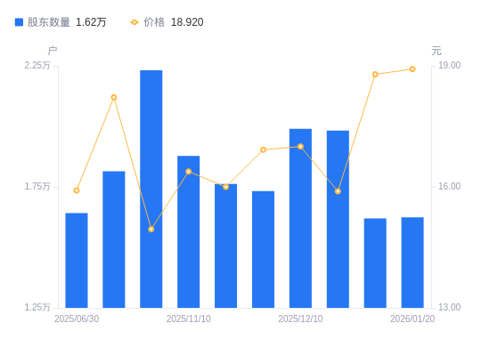 日期A股户数(户)流通A股户均持股数(股)户均持股市值(万元)2026-01-201624339044.5173.872026-01-101619539160.2373.582025-12-201982531989.9150.832025-12-101989831872.5554.182025-11-281732436608.1761.942025-11-201762135991.1557.592025-11-101877633777.1655.332025-10-202231728417.8042.482025-09-301814034961.4163.702025-06-301641638633.0461.47