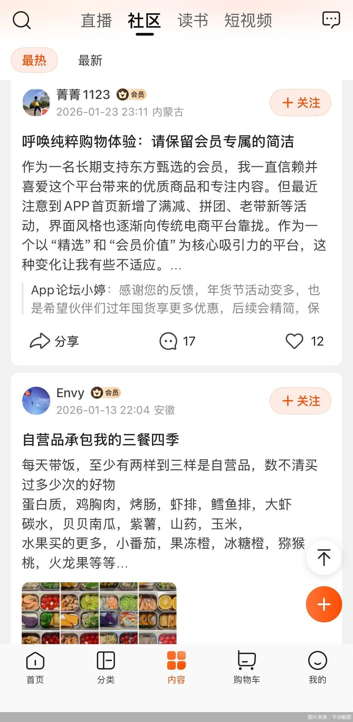 2025年6月,东方甄选推出的自营卫生巾,有用户反馈存在外包装隐私问题,东方甄选便对第二批次的箱子进行调整。而平台一款健康零食类目TOP3“无添加的苹果干”爆款产品,则来自2024年一位用户在社区的提议。此后,团队用半年时间完成原料筛选、工艺测试、小批量试产,并在社区同步进度。