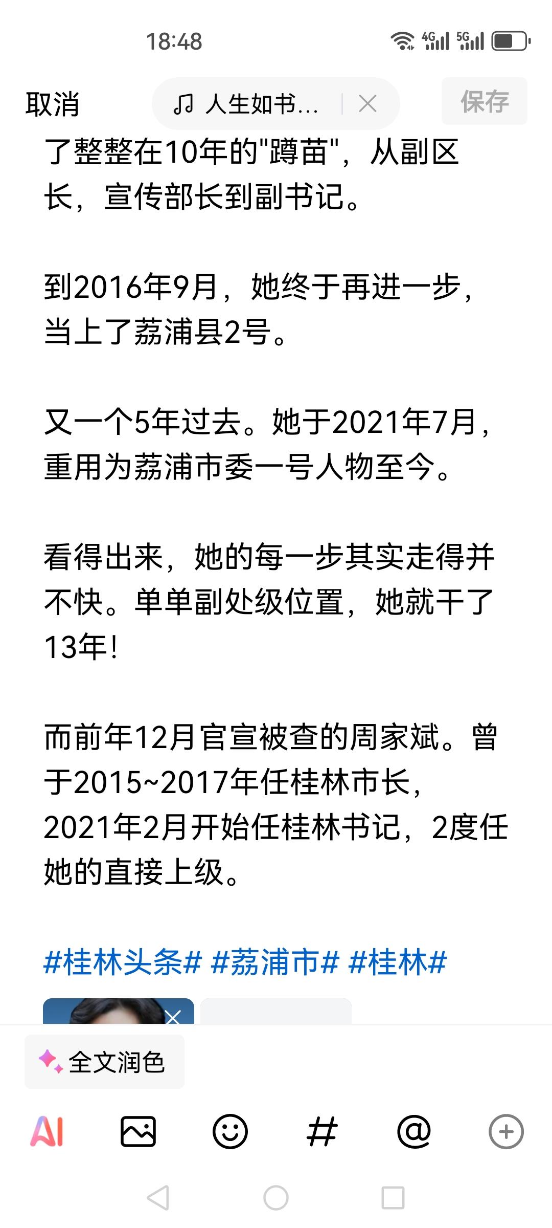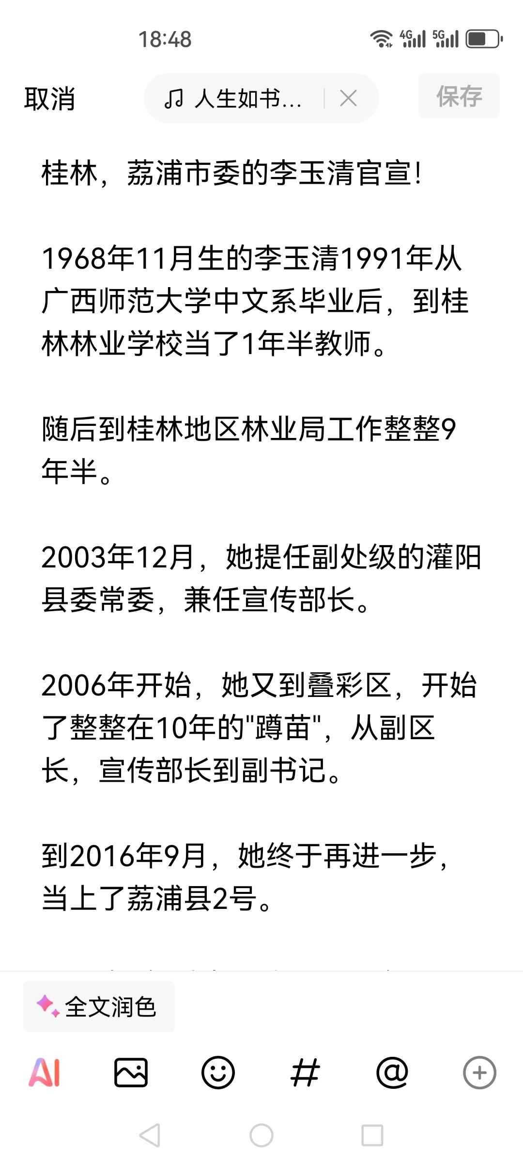 桂林,荔浦市的已59岁李玉清官宣! 1968年11月生的李玉清绝对是优秀分子,1991大学毕业前一个月前加入组织。 随后到桂林林校只当了1年半教师, 就跨界进入原桂林地区林业局工作, 9年半后,34岁的她提任副处级的灌阳县委常委。 2006年开始,她转任叠彩区,开始了10年的"蹲苗",从区府副职,一直到副书记。 2016年9月,已48岁的她终于当上了荔浦县长,这在现在是很难见到的。 又过了近5年,53岁的她才当上荔浦市书记,典型的大器晚成。 毕竟,这个年龄出任书记,在全国也很难见到吧? 只是,没想到,已59岁的她,在新年第一个月里,就遭遇了人生最大的滑铁卢! 嗨! 桂林