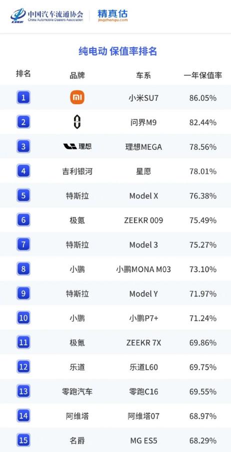 《2025年度中国汽车保值率报告》显示,纯电动保值率排名前三名为:小米SU7、问界M9、理想MEGA。榜单排名如下:
