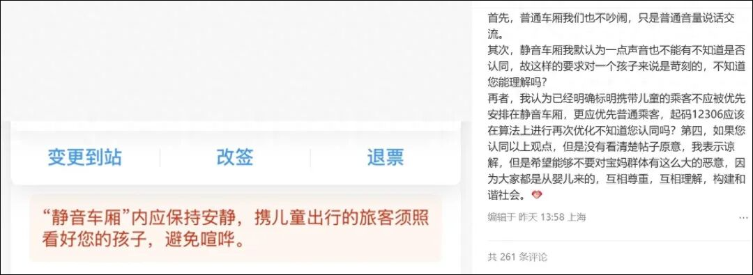 页面显示,标注“‘静音车厢’内应保持安静,携儿童出行的旅客须照看好您的孩子,避免喧哗。”该网友感到实在难安,“我家孩子属于安静的,但一点声音没有是绝对不可能的,这种该怎么办呢?”