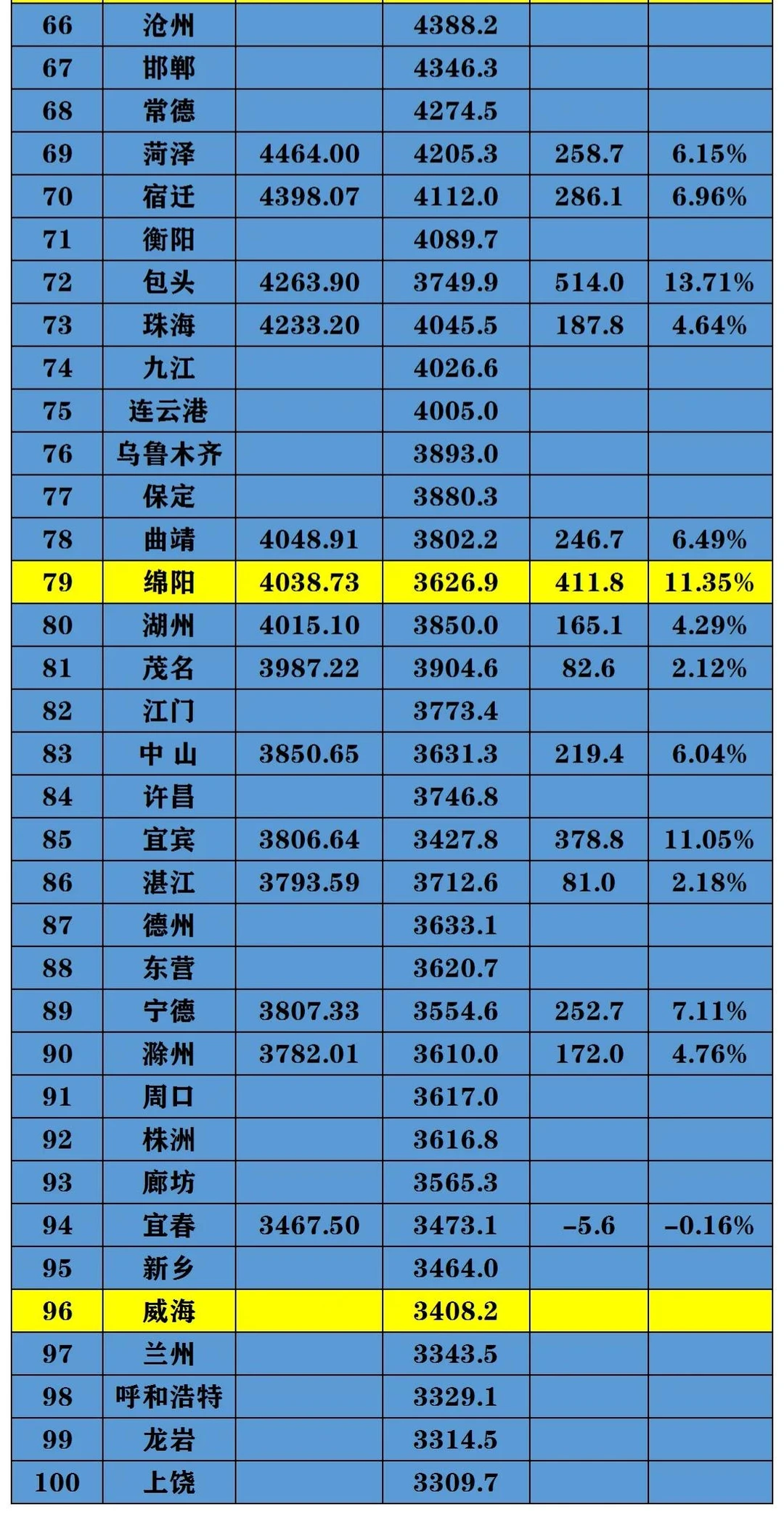 黑龙江哈尔滨:2023年GDP位列第54位。 山东省淄博市:2023年GDP位列第65位。 贵州省黔东南:2023年GDP位列第225位。 位列前四的还是北上广深,而后是重苏成杭武南。在位列前十位的城市中,要么是省级市,要么是副省级市,要么是省会,唯有苏州是地级市,所以它应该才是最牛的城市,一个不是省会的地级市能跻身前十位列第六,确实厉害啊。值得一提的是2023年特别火的三个城市:淄博的烧烤、黔东南的村超、哈尔滨的冰雪节,都带动了GDP的快速增加,所以“人气”才是一个城市最打动人心的地方。