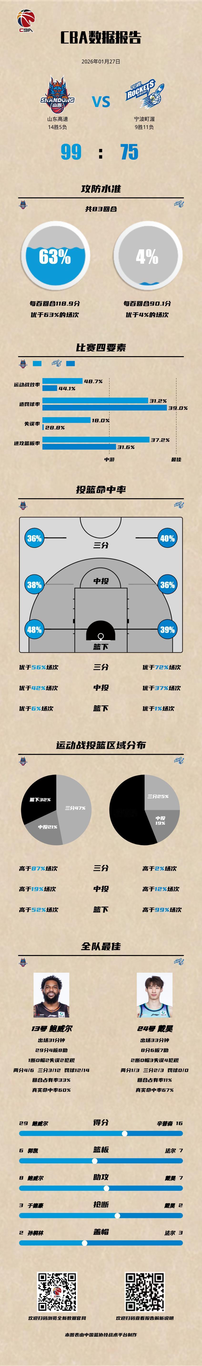 山东高速 99-75 宁波町渥 山东男篮vs宁波男篮 山东高速:鲍威尔29分4篮板8助攻,高诗岩15分4篮板3助攻3抢断,克里斯11分6篮板2抢断; 宁波町渥:辛普森16分7篮板6助攻,杰克逊12分,法尔8分7篮板3盖帽。以城之名