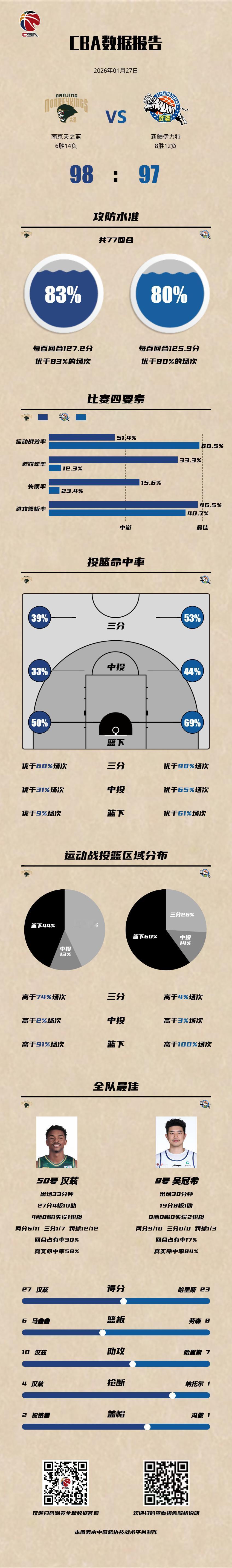 南京天之蓝 98-97 新疆伊力特 同曦男篮vs新疆男篮 南京天之蓝:汉兹27分4篮板10助攻4抢断,赵柏清17分6篮板,马内克14分5篮板; 新疆伊力特:哈里斯23分7助攻,阿不都沙拉木21分5篮板,吴冠希19分8篮板。以城之名