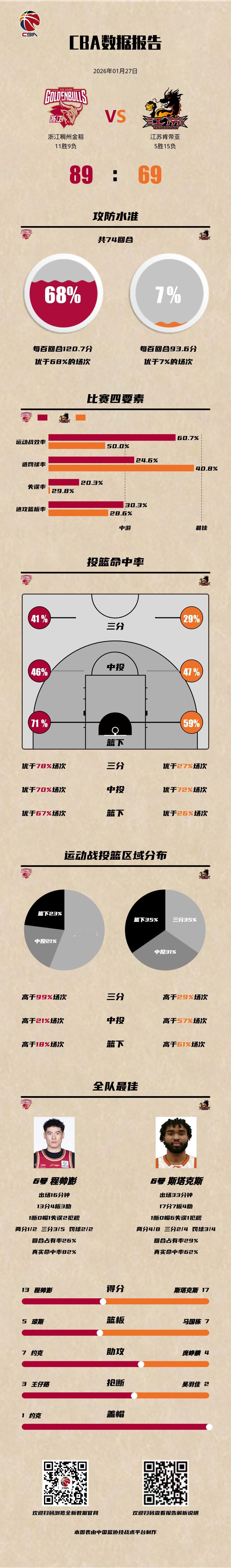 浙江稠州金租 89-69 江苏肯帝亚浙江男篮vs江苏男篮 浙江稠州金租:程帅澎13分4篮板3助攻,琼斯12分5篮板,约克11分3篮板7助攻; 江苏肯帝亚:斯塔克斯17分7篮板4助攻,亨特13分5篮板,马国栋10分7篮板。CBA数据库