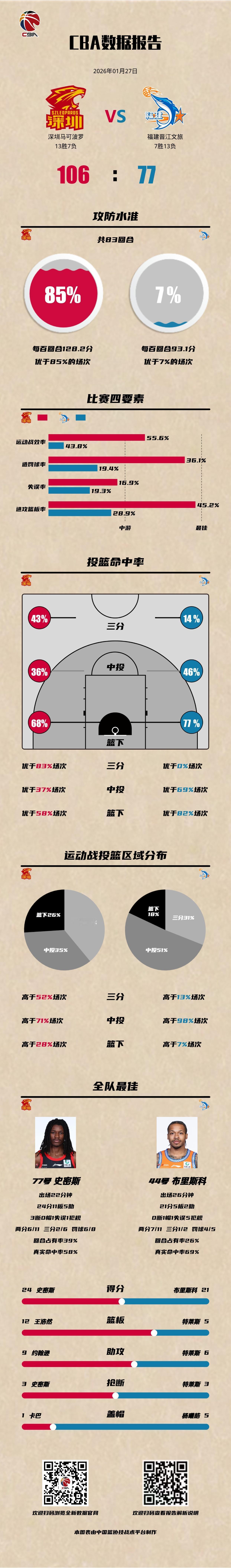 深圳马可波罗 106-77 福建晋江文旅深圳男篮vs福建男篮 深圳马可波罗:史密斯24分11篮板5助攻3抢断,王浩然20分12篮板5助攻,贺希宁17分7篮板8助攻; 福建晋江文旅:布里斯科21分5篮板,特莱斯12分5篮板6助攻3抢断,曾凌铉10分4篮板。CBA数据库