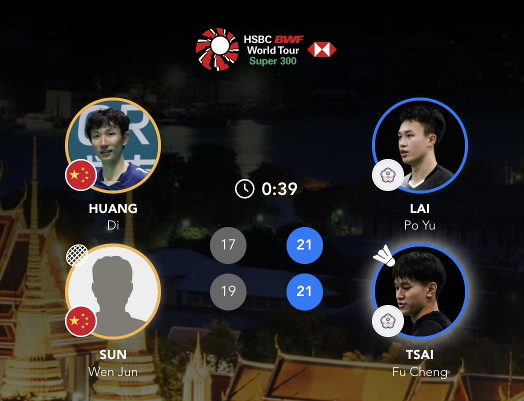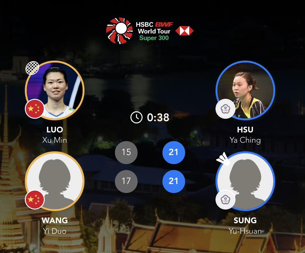 国羽泰国大师赛双打四连败! 1月27日,在羽毛球超级300泰国大师赛首轮男女双打比赛中,国羽已经四盘连败! 黄荻/孙文骏 17-21、19-21 赖柏佑/蔡富丞 罗徐敏/王漪朵 15-21、17-21 许雅晴/宋祐媗 陈永锐/陈喆涵 21-17、19-21、19-21洪魁俊/吕俊玮(资格赛) 坑姝良/李华洲 11-21、 18-21大泽佳步/田部真唯 还有两盘比赛正在进行。 陈旭君/刘阳 21-16、19-21 查能蓬/通萨 鲍骊婧/李怡婧 21-12、21-5 潘达姐妹