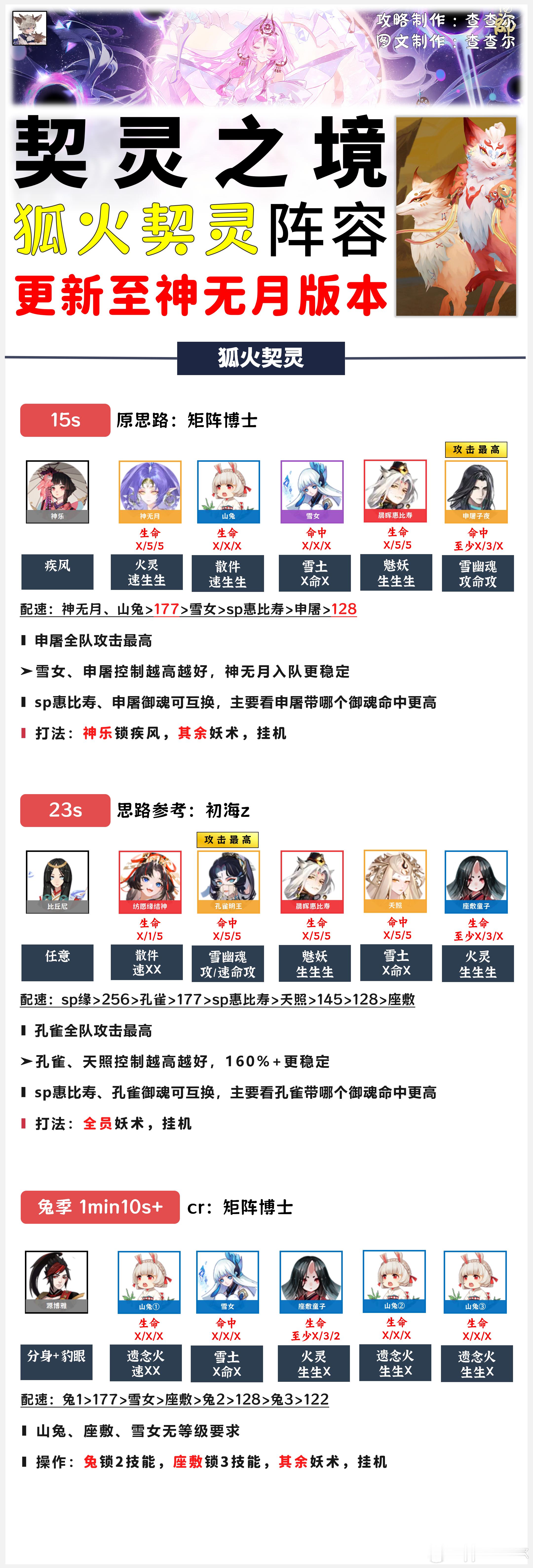 阴阳师手游超话创作官acg优创官 【契灵之境】狐火契灵,3套阵容+阵容码(神无月版本)■因9图放不下,所以阵容码+攻略合集拆开发■契灵之境攻略合集请移步评论区置顶,我会附好链接狐火契灵文字码:①15s|TA|bbfe39cfe5041fe4b1c133de79e1d4ec②23s|TA|04679bc6163649079b53c4c9f4b10553③低配兔雪|TA|11cb0c76eeb29ecce8e5b0cd82377ea8