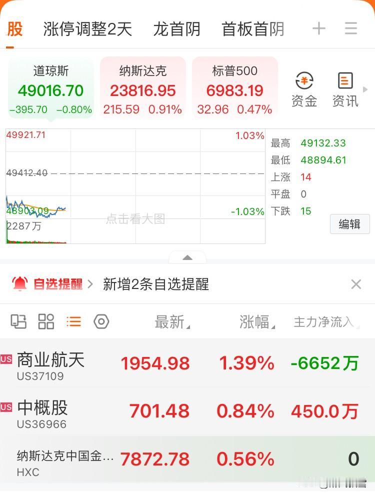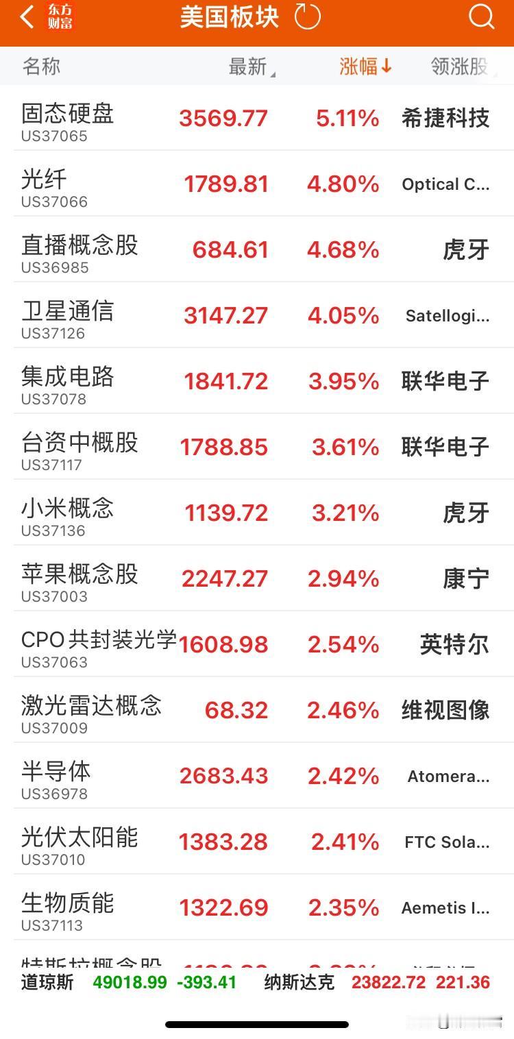 美市场开盘 开盘1个半小时数据。 1. 指数表现 道琼斯工业平均指数收跌0.80%纳斯达克指数上涨0.91%,报23816.95点;标普500指数上涨0.47%,报6983.19点,科技与成长板块走强[赞] 2. 领涨板块 科技与硬件:固态硬盘(+5.11%)→存储芯片、光纤(+4.80%)、集成电路(+3.95%)、半导体(+2.42%)领涨,反映市场对AI算力与硬件升级的持续看好。 通信与卫星:直播概念股(+4.68%)、卫星通信(+4.05%)、太空概念(+1.97%)表现活跃,商业航天相关板块联动上涨。 资源与医药:煤炭概念(+2.30%)、金属(+2.24%)、免疫治疗(+2.22%)、抗癌医药(+2.12%)同步走高,兼具防御与成长属性。 3. 中概股表现 中概股指数上涨0.84%,纳斯达克中国金龙指数上涨0.56% 4. 资金与情绪 美股呈现分化行情,纳指与标普500的上涨主要由科技板块驱动,而道指的下跌反映了传统蓝筹的短期获利回吐。板块轮动加快,科技、资源、医药等多线开花,市场情绪整体偏暖。