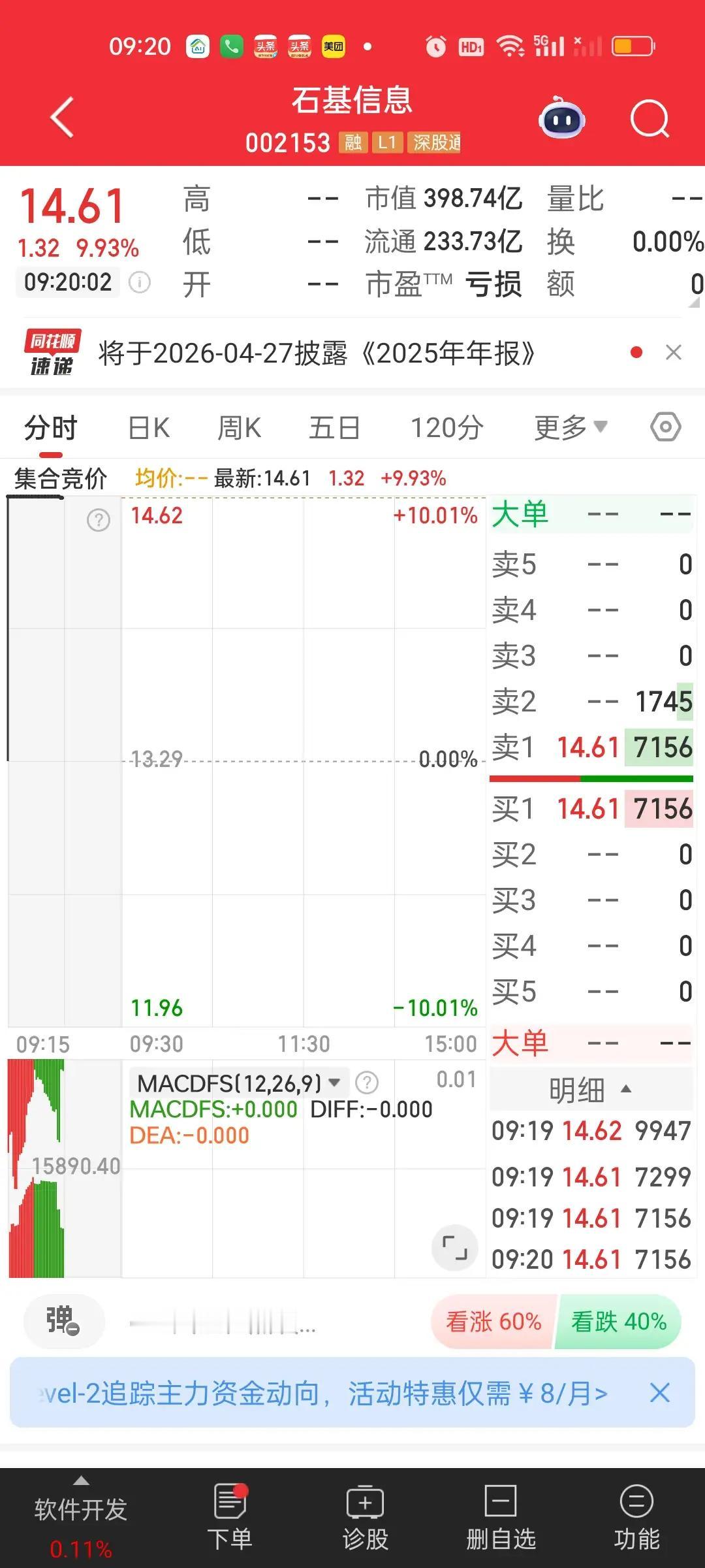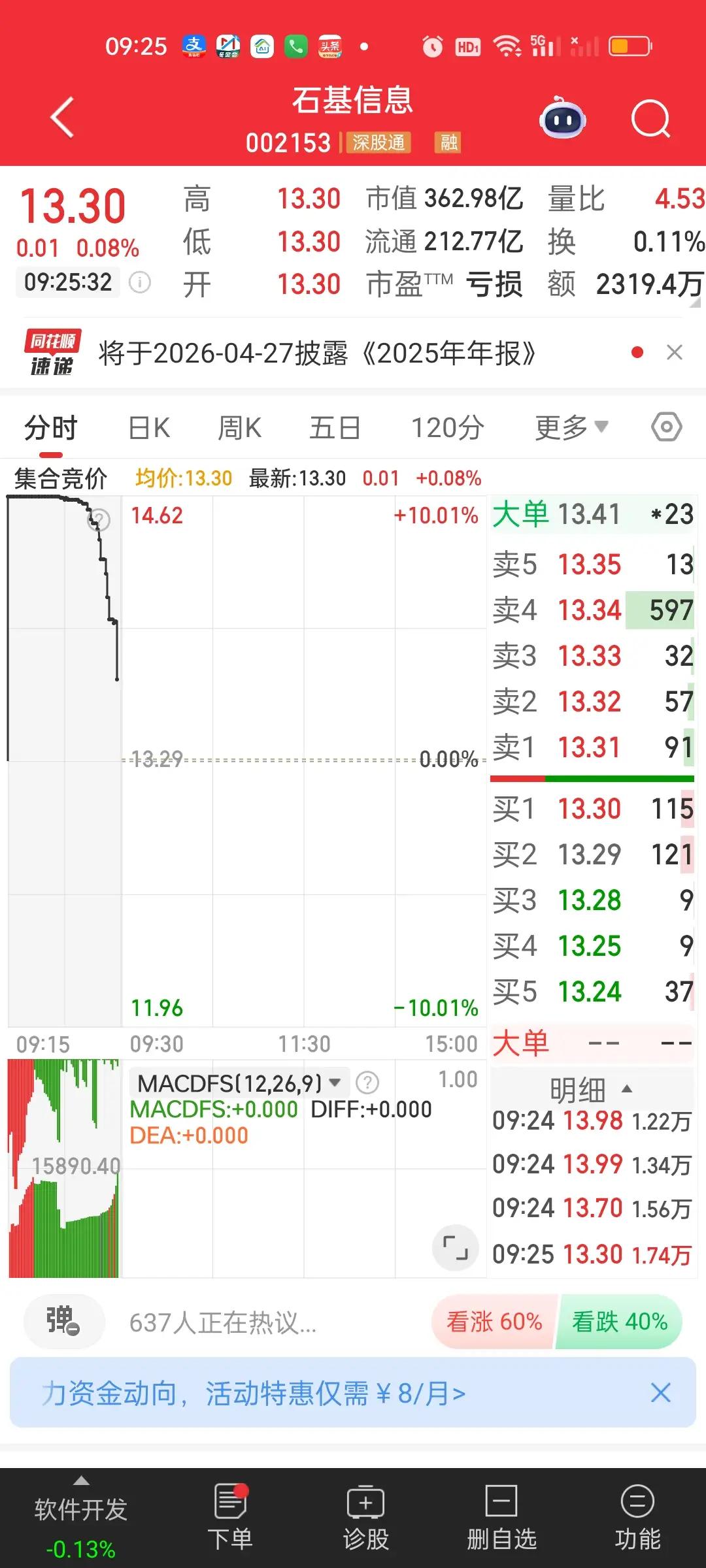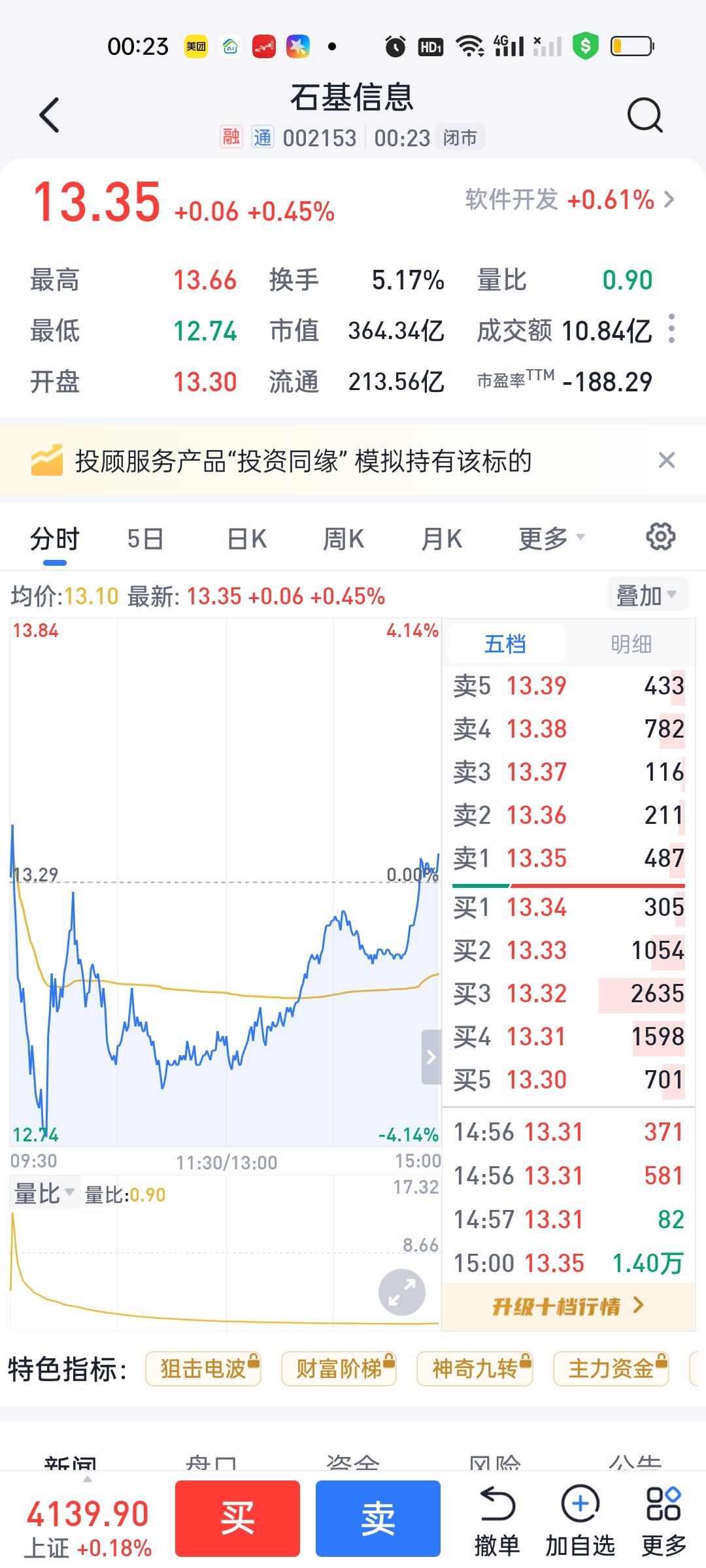集合竞价阶段看到石基涨停我还挺惊喜的,因为我压根就没有想过要久拿,买它纯粹是误打误撞,昨天买的300股底仓今天如果高开肯定是要出的,如果涨停开盘,这意味着我有400元的利润。昨天收盘价是13.29,涨停开盘就是14.62-13.29=1.33。1.33*300=399元。 可是被撤梯子了,开盘价13.30,居然就涨了1分钱。我直接反手挂了13.50卖出全部仓位,然后在20日线挂了200股顺利买进,在12.72又挂了200股,可是最低价只到12.74,就差2分钱没有买入成功。如果12.72买进,收盘价13.35,13.35-12.72=0.63,0.63*200=126元。200股如果买入成功,可以多挣126元,这也是一个不大不小的遗憾。