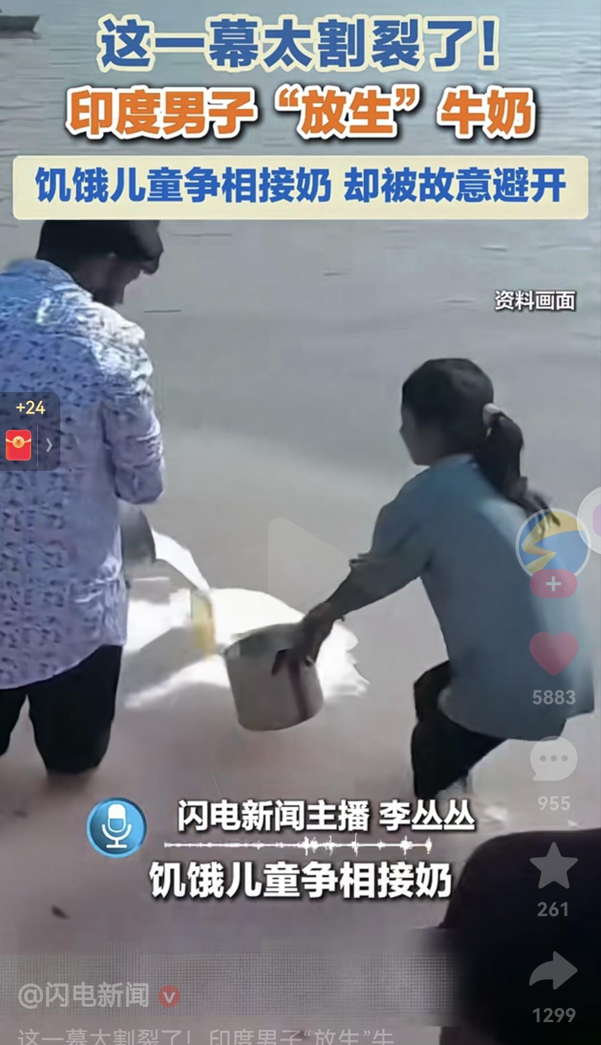 家人们,我刚刷到这个视频的时候,整个人都愣住了,心里真的堵得慌。我就纳闷了,为什么没有一点爱心呢?为什么宁愿把牛奶倒掉,也不愿意给贫困的孩子呢? 根据闪电新闻的报道,1月21日,在印度的恒河边,一个男人站在水里,正在把一桶又一桶的牛奶倒进河里,嘴里还念念有词,好像在做什么“放生”仪式。 这一幕被几个孩子看到了,直接拿着桶来接牛奶,视频中几个孩子饿得面黄肌瘦,手里拎着破塑料桶,眼巴巴地盯着那些浪费掉的牛奶,急切地凑过去想接一点。 可这个男人看到孩子们靠近,居然立刻改变姿势,故意把桶往河中间挪,甚至调整角度,就是不让牛奶洒到孩子们的容器里。 牛奶哗哗地流进浑浊的河水,转眼就没了踪影,而孩子们只能蹲在旁边,眼睁睁看着能填饱肚子的东西被浪费掉。 网友看到后评论说:“这哪是祈福,这是造孽啊,孩子都快饿晕了,他还把奶倒河里。” 还有的网友怒怼:“装什么虔诚,真有善心不如把牛奶分给孩子,做表面功夫给谁看。” 也有网友心疼孩子:“看那孩子的眼神,盯着牛奶的样子,谁看了不难受。” 看完这个视频,我心里真不是滋味。 一边是饿到眼睛发直的孩子,一边是把食物当“祭品”的信徒,这画面的割裂感,让人觉得荒诞又心疼。 这些孩子可能一天都没吃上一口热饭,对他们来说,这桶牛奶不是普通的水,是他们活下去的希望。 而那个倒牛奶的男人,宁愿把牛奶喂给河里的鱼,也不愿意分给眼前的孩子,真的太冷漠了! 看到男子的行为,也让我想起了一句话:“当信仰变成了冷漠,神圣也就失去了温度。” 其实,真正的善良,从来不是对着河水祈祷,而是蹲下来,把手里的牛奶递给那个最需要的人。 大家觉得呢?欢迎大家评论区讨论留言。