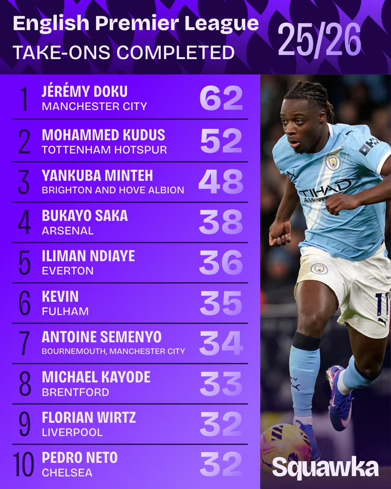 虎扑01月28日讯数据机构Squawka公布了2025-26赛季英超联赛至今的成功过人次数排行榜,曼城边锋杰里米·多库以62次成功过人高居榜首,成为本赛季英超最具冲击力的突破手。