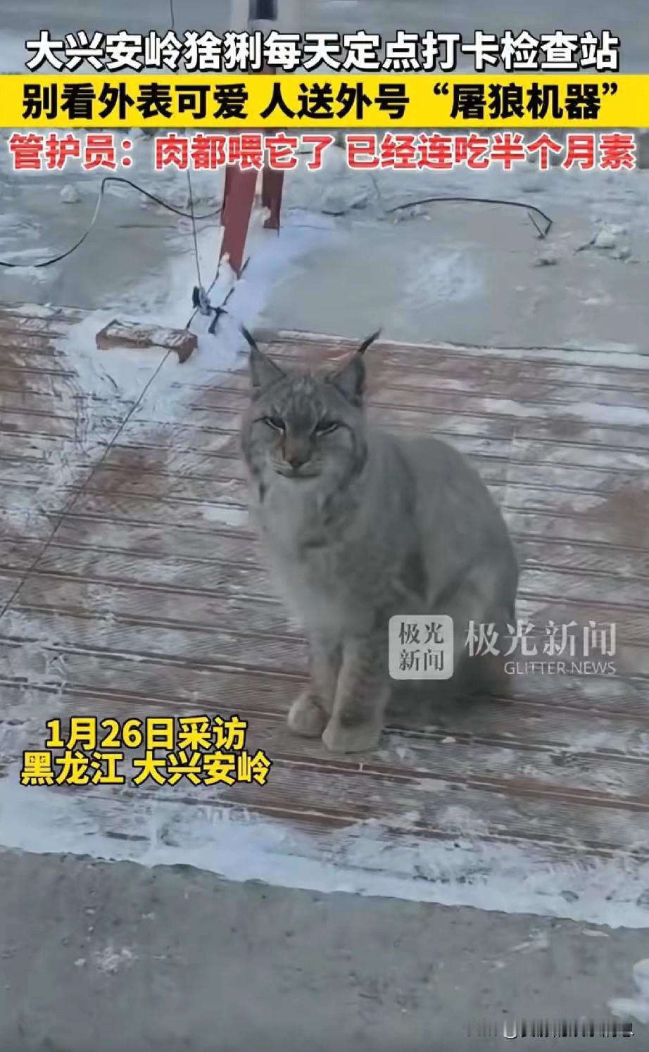 黑龙江大兴安岭检查站发现了只猞猁经常到此地出现。 护管员看了很可怜,就