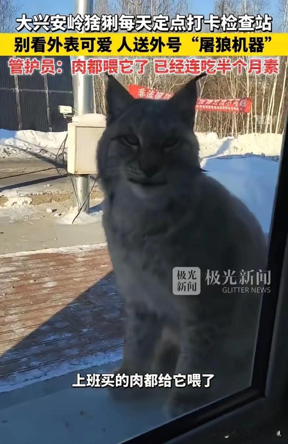 黑龙江大兴安岭检查站发现了只猞猁经常到此地出现。 护管员看了很可怜,就给它喂了块生肉。没想到就这一次,这只猞猁就成了“常客”,每天上午九点半,下午三点半准时来这儿“打卡”吃肉。 前几天护官员拿块生肉去喂它,好奇围过猞猁就蹲在护管员前面不到两米的地方,盯着那块肉直流口水,护管员把肉扔在地上,它立马扑过去抢肉,叼着肉就跑了。 没想到这么漂亮的动物这么近距离观察过。不过这只猞猁爪子能伸半尺长,捕猎能力强,是个顶级猎手,检查站怕出现什么意外,决定每天给它送肉吃,并挂牌提醒:“请勿靠近动物,以免发生危险。”护管员笑着说:“我快成素食者了。”