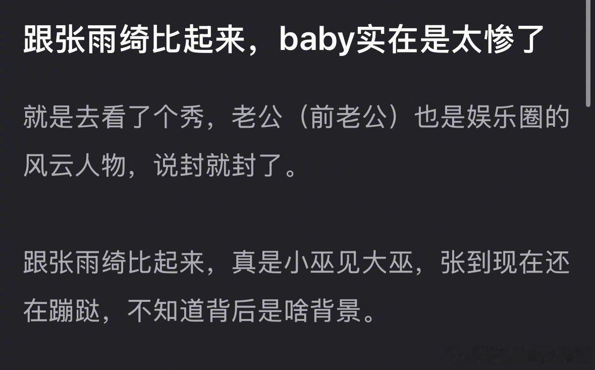 说Angelababy比张雨绮“更惨”,其实是把“资源下滑的憋屈”和“触碰法律红线的塌房”搞混了。两人的困境根本不在一个量级——张雨绮是踩了代孕违法的雷、被春晚除名、商业价值清零,大概率要面临行业封杀;而Angelababy多是资源降级、时尚圈翻车、演技争议,本质是事业瓶颈,远没到“终局性崩塌”的地步。 张雨绮:法律红线踩得狠,塌房无翻身可能 - 代孕疑云+律师威胁:葛晓倩晒公证双胞胎护照(出生日期差3个月)、疑似代孕合同,还曝光2024年被律师威胁,涉事律师与张雨绮关系密切,这可是触碰法律与公序良俗的致命黑料。 - 春晚除名+商业雪崩:辽视春晚紧急删节目、换人补录,等于官方给口碑判“临时死刑”,代言连夜下架,合作品牌集体跑路,商业价值一夜归零。 - 黑料堆成山:插足婚姻(监控+行李标签铁证)、婚内动刀、炫富言论(699元买不了袜子)、暗讽他人,人设彻底崩塌,团队还捂嘴不回应,越描越黑。 Angelababy:事业下滑,没碰法律底线 - 时尚圈翻车:2026年1月高定直播被设计师吐槽“未授权商用”“鞋子廉价”,但很快澄清是造型团队沟通疏漏,没伤筋动骨。 - 资源降级:离婚后奢侈品牌解约、《跑男》不再常驻、影视多演配角,但仍有代言和时尚资源,还能走巴黎时装周,曝光没断。 - 争议无实锤:演技差、片酬争议、疯马秀周边同框等,多是口碑和事业层面的问题,没有违法或严重失德的实锤,舆论反噬远不如张雨绮。 核心区别一眼懂 - 性质:张雨绮是违法+严重失德,Angelababy是事业瓶颈+口碑争议。 - 后果:张雨绮或被行业封杀,Angelababy只是资源降级。 - 翻盘难度:张雨绮几乎无可能,Angelababy仍有靠时尚或综艺回暖的机会。 网友觉得Angelababy“惨”,不过是对比张雨绮的“作死式塌房”,觉得她的资源下滑更“憋屈”。但论实际代价,张雨绮才是真的为“荒唐”买单,Angelababy顶多算“时运不济”。 张雨绮被曝代孕 张雨绮