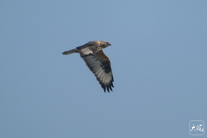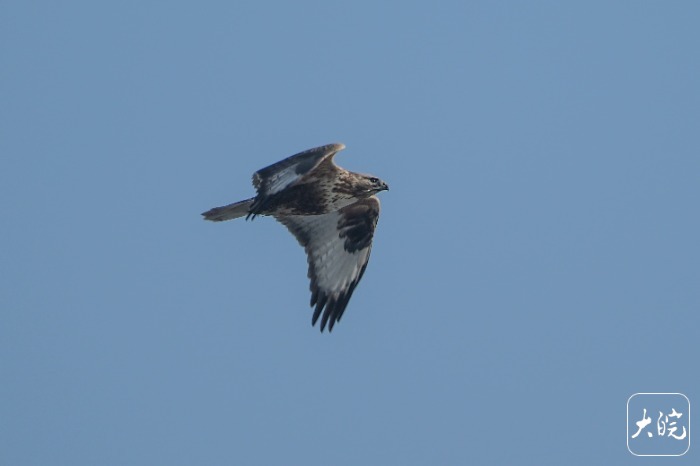 大鵟(kuáng)是鹰形目鹰科鵟属的大型猛禽,广泛分布于亚洲中部、中南部至西伯利亚东南部和中国东北部,活跃于山地、山脚平原、草原、高山林缘、开阔山地草原与荒漠地带。大鵟是鵟属中体型最大者,总长度57至72厘米,翼展143至161厘米,存在浅色和深色两种形态。主要食物为小型哺乳动物,如鼠类和野兔,偶尔也会捕食鸟类和昆虫。在安徽为罕见冬候鸟,数量稀少,近年来仅在蚌埠、霍邱、巢湖等地有过记录,明光发现的这只大鵟由鸟类生态摄影师姜金山在七里湖附近拍到。