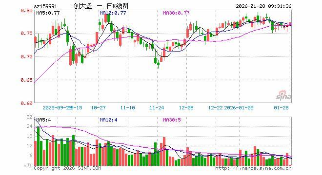1月28日,创大盘ETF(159991)开盘涨0.00%,报0.767元。创大盘ETF(159991)重仓股方面,宁德时代开盘跌0.45%,中际旭创涨2.66%,新易盛涨1.44%,东方财富涨0.00%,阳光电源跌0.42%,胜宏科技涨0.03%,汇川技术跌0.56%,迈瑞医疗跌0.03%,天孚通信涨2.83%,亿纬锂能跌0.62%。