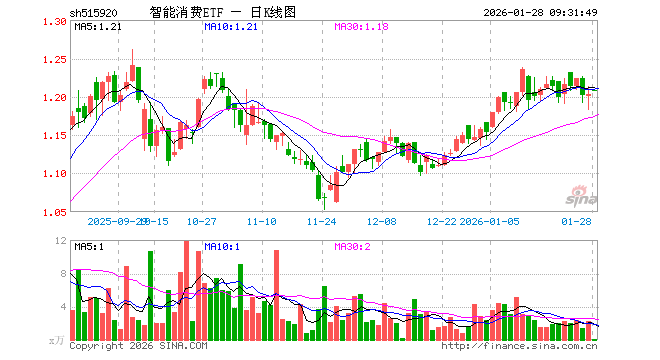 1月28日,智能消费ETF(515920)开盘涨0.42%,报1.208元。智能消费ETF(515920)重仓股方面,比亚迪开盘跌0.01%,寒武纪涨0.69%,美的集团跌0.01%,立讯精密跌0.04%,工业富联涨2.18%,中芯国际涨0.76%,格力电器涨0.00%,胜宏科技涨0.03%,京东方A跌0.22%,兆易创新涨2.15%。