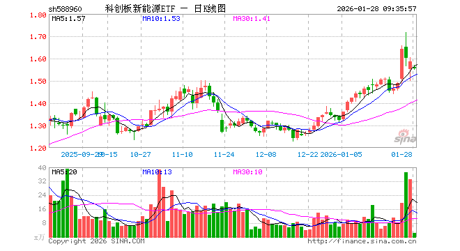 科创板新能源ETF(588960)业绩比较基准为上证科创板新能源指数收益率,管理人为富国基金管理有限公司,基金经理为苏华清,成立(2025-02-06)以来回报为57.81%,近一个月回报为15.98%。