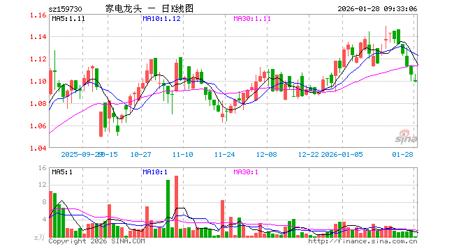1月28日,龙头家电ETF(159730)开盘跌0.45%,报1.100元。龙头家电ETF(159730)重仓股方面,三花智控开盘跌0.61%,格力电器涨0.00%,美的集团跌0.01%,海尔智家跌0.04%,德业股份涨0.00%,科沃斯跌0.22%,石头科技跌0.24%,公牛集团跌0.17%,海信家电涨0.00%,老板电器涨0.45%。