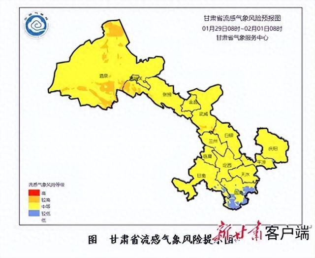 受较强冷空气影响,结合传染病流行规律,预计1月29日至2月1日清晨,甘肃大部流感气象风险等级为中等,其中酒泉(肃北、瓜州、阿克塞)、张掖(肃南、民乐)、武威(天祝)等地流感气象风险等级较高。