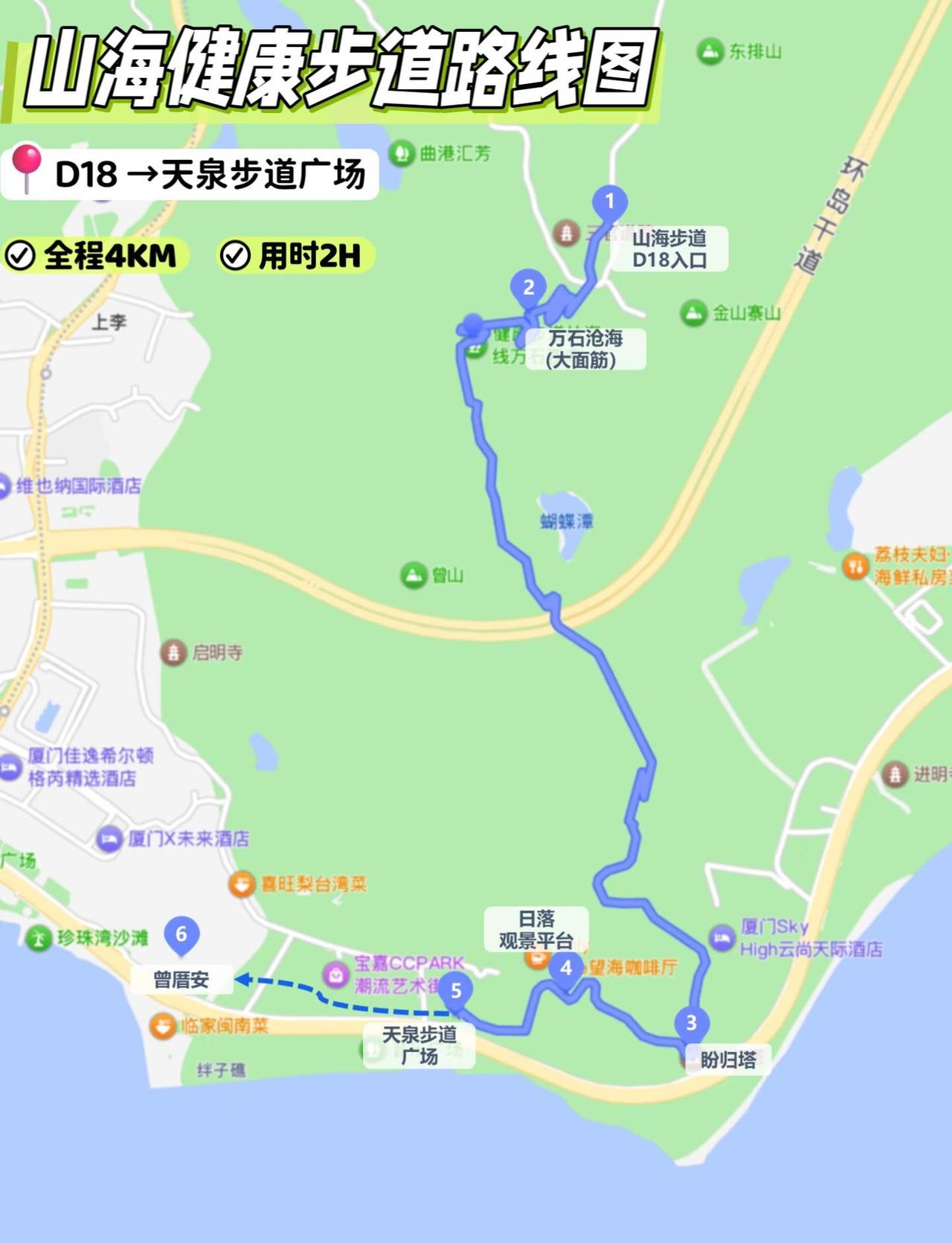 厦门|带父母首推山海步道‼️2H不废腿路线 第2次来厦门,比起鼓浪屿和中山路步行街,更推荐山海健康步道,不需要门票,风景顶顶好,摄影组老爸和出片组老妈都很满意,基本是下坡路段,台阶很少,懒人友好可以轻松走完 📍推荐路线: 山海步道(D18入口) →万石沧海•大面筋→盼归塔•金门标语→日落观景平台•看日落→天泉步道广场→曾厝安(吃晚餐) 全程4KM不走回头路(线路图见P16),看完日落可以去曾厝安干饭(步行10Min),吃完顺道逛逛曾经的顶流 ⏰用时:2H (包含拍照时间) 🚖交通:滴滴可直接定位D18入口 🌅日落:看好日落时间,建议冬季下午2-3点出发,夏季下午3-4点出发,没那么晒光线也好,可在日落前抵达观景台 📸拍照机位总结 🔸万石沧海•大面筋 P2-5 「大面筋」这一段,一边是蓝色海岸线,一边是绿色山林,不需要无人机就能俯瞰上李水库全景 🔸盼归塔 P7-9 270°观景平台,用长焦可以拍到金门岛八个大字的标语「三民主義統一中國」,山体右側能看到青天白日旗 🔸日落观景台 P11-14 盼归塔继续往前走3Min到达厦门版LaLaLand观景台,日落前可以看到橘子海,冬季的日落会被山体挡住看不到太阳沉入海平面,观景台也适合拍人像和双子塔同框 🍽️晚餐推荐 喜旺梨 | 台湾菜 P15 💰人均70 坐标曾厝安,菜式和口味都是正宗台味!三杯鸡有加九层塔提香,蚵仔煎浆调得很好,口感不油海蛎很嫩,甜辣酱是灵魂,卤肉饭肥而不腻,微甜很入味 ⚠️TIPS: 1️⃣盼归塔附近临海风超大,帽子有必要,大面筋有电梯,一路上休息区和洗手间很多,可以随时歇脚,沿途有自动贩卖机和接热水的地方 2️⃣不建议自驾,全程不走回头路 3️⃣冬天海边紫外线还是挺强的,做好防晒 带着父母去旅行 长辈友好旅行地 大海与落日厦门山海健康步道 厦门旅游 厦门 厦门日落 橘子海 厦门拍照