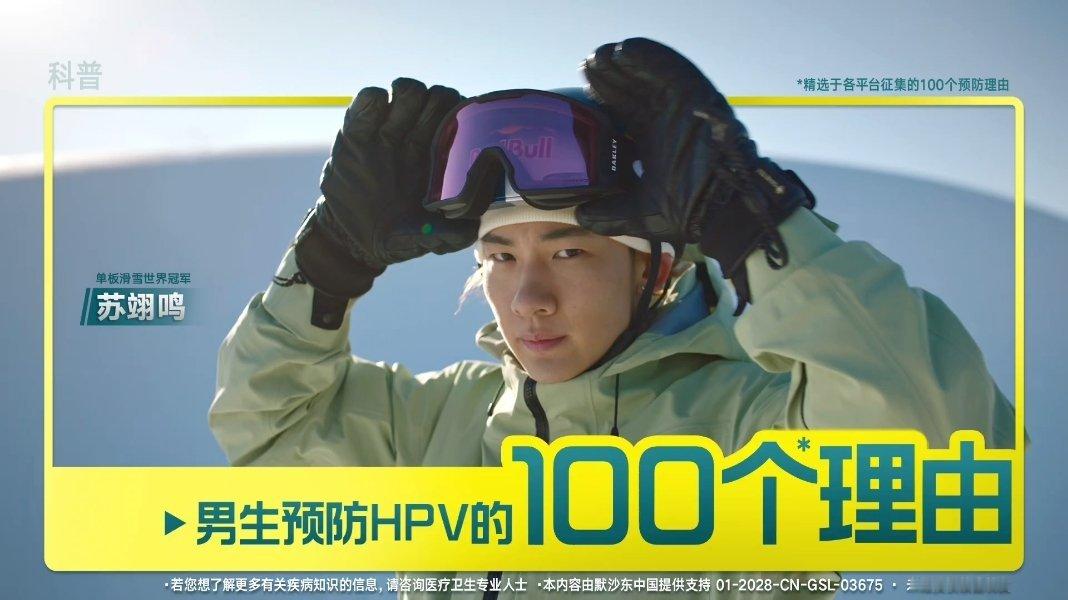 苏翊鸣健康备战蓄势待发和苏翊鸣一起守护健康以前对HPV真没啥概念,总觉得这玩意儿离咱男生无关,没有机会发生在自己身边。不过刚看到苏翊鸣刚发的TVC《男生预防HPV的100个理由》才知道以前的想法真是太天真了,也逐渐对HPV有了更深刻的认知和体会。一项研究估算在HPV疫苗上市前,至少有一位异性伴侣的男生一生中感染HPV的概率为91.3%,相当于每10人中就有9人可能感染HPV 。如果忽视了HPV防护,很可能就会被悄悄缠上。而HPV持续感染带来的风险不容小觑~宫颈癌、肛门癌、生殖器疣……这些名词光是听到就让人心头一紧。😢可怕的不是疾病本身而是很多人还对它抱有误解~❌ “HPV只是女性的问题,男生不可能得HPV”❌ “没症状就不用管”其实,HPV没有性别之分,男性同样可能感染并成为隐性传播源。男生持续感染HPV也可能导致多种癌症或疾病!保护好自己,也是保护她!真正的健康,不是女生一个人的责任,而是男女共防的课题。男生也可能感染HPV ,每个男生都有必须预防的理由。中国男性HPV感染的第一个高峰在18-24岁,越早预防越早保护!男生预防HPV,就差你上场,就像苏翊鸣说的~HPV就像雪场里的暗冰,看不见却在身边潜伏,如果忽视就会带来未知的风险。提前做好准备,跟医生咨询预防方式,包括是否接种HPV疫苗,越早预防越早保护,让健康成为上场的底气。✅主动咨询医生,别等到有症状才想起健康✅呼吁身边的朋友、恋人一起接种和防护✅在社交平台分享真实经验让更多人知道HPV不是女生一个人的战斗,男生也可能感染HPV ,每个男生也都有必须预防的理由。只要我们认真做到疫苗+筛查+安全行为,一定能让HPV无处遁形的。