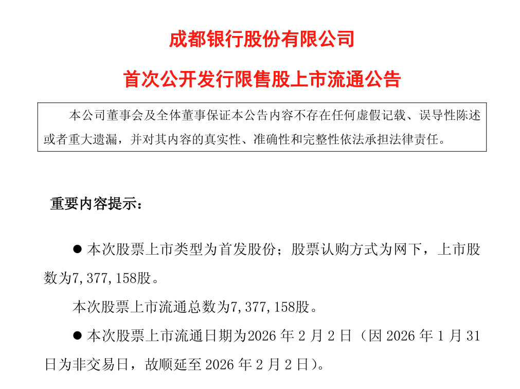 这笔股份仅占当前总股本的0.17%,体量虽小,象征意义却尤为厚重——随着这批由167名时任董监高及其亲属、核心员工持有的股份解禁,成都银行的限售流通股将彻底清零,自2018年1月31日上市以来,历经八载寒暑,该行正式迈入“全流通”时代。