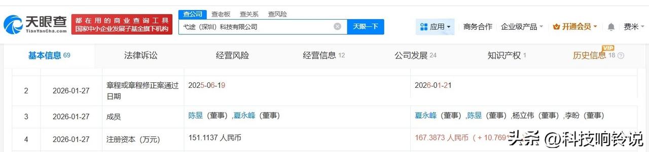【字节跳动等入股汽车软件研发商弋途科技】 天眼查工商信息显示,近日,弋途(深圳)科技有限公司发生工商变更,新增字节跳动旗下北京量子跃动科技有限公司、芜湖基石先启未来创业投资基金合伙企业(有限合伙)等为股东,同时,注册资本由约151万人民币增至约167万人民币。 弋途(深圳)科技有限公司成立于2023年10月,法定代表人为吴小航,经营范围包括汽车零部件及配件制造、智能车载设备制造、智能车载设备销售等。股东信息显示,该公司现由吴小航、苏州戈途科技合伙企业(有限合伙)及上述新增股东等共同持股。公开资料显示,该公司致力于汽车行业基础中间件、服务中间件、AI中间件的研发和商业化落地。 天眼查信息: