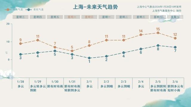 上海今天(1月28日)多云。受辐射降温影响,早间气温较低,大部分郊区最低气温在-3℃~1℃之间,以金山-2.9℃为最低。白天暖阳相伴,气温有所上升,预计最高气温在9℃附近,今天风力减小,东北风3~4级,午后体感会比前两天温暖一些。