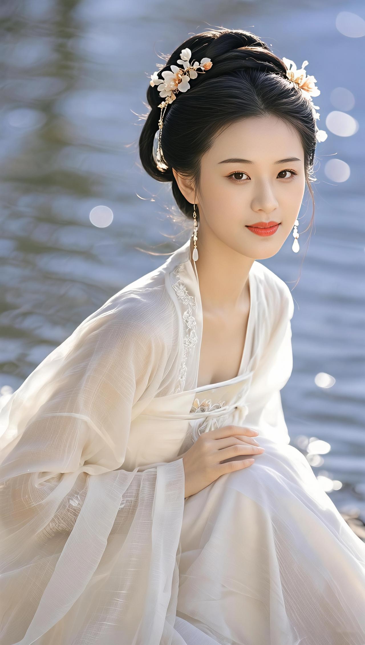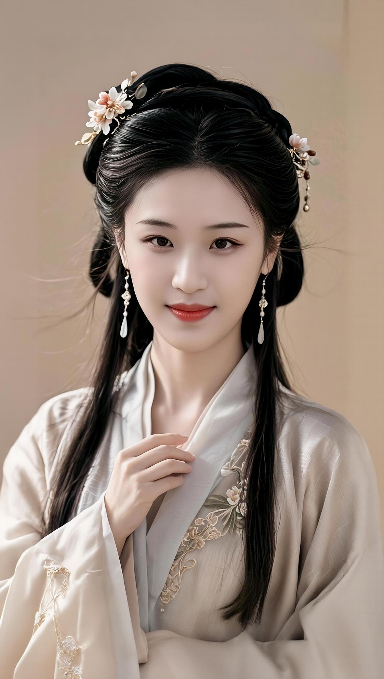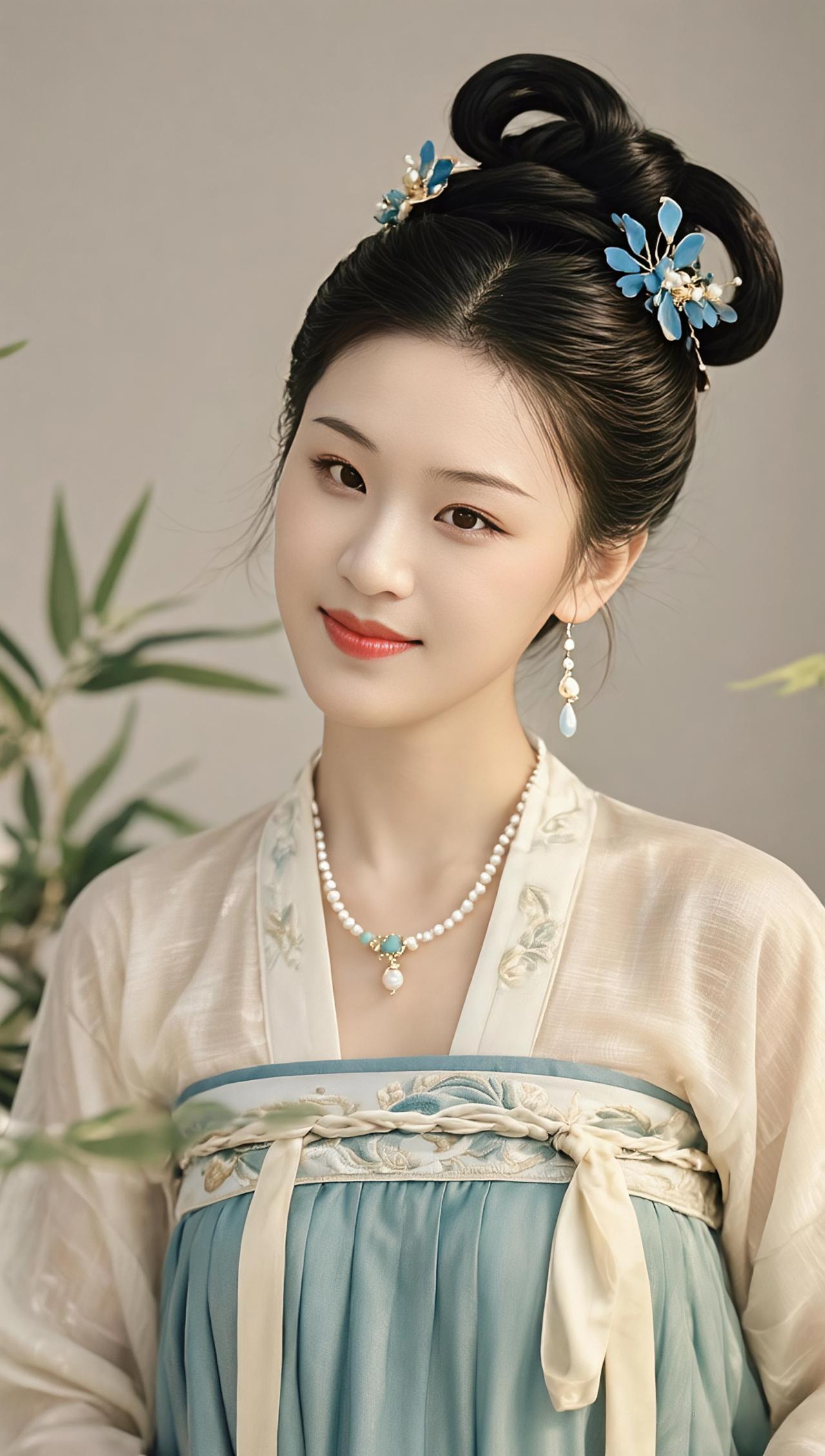 林光初透晓烟轻,翠袂红绦立晓晴。 云鬓簪花凝露色,春山横黛带柔情。 微抬素手惊鸿起,半转星眸落雁停。 莫道仙娥天上有,人间初见已倾城。 绿裳古风照 晨雾漫过林梢 你是一片青瓷,被风轻轻托举 红带是釉色里跳脱的朱砂 在薄如蝉翼的翠色里流淌 发间的银饰垂着细碎的光 像晨露刚吻过海棠 你抬手的弧度,是云舒展的模样 目光流转时,山风也为你停了半晌 不必问仙乡何处 此刻,你就是雾色里最温柔的具象