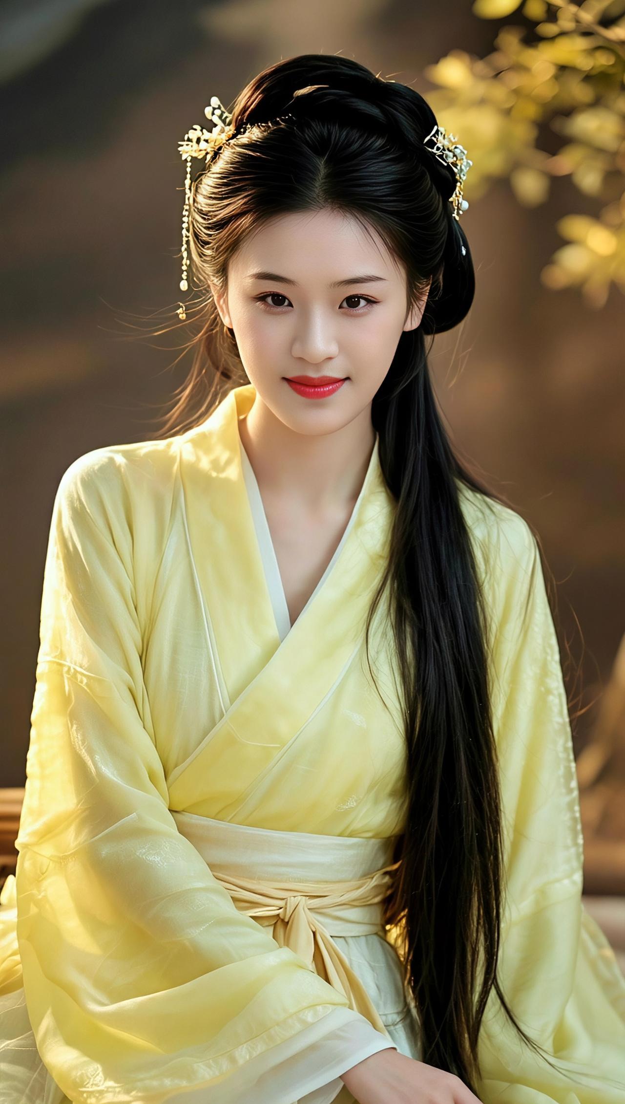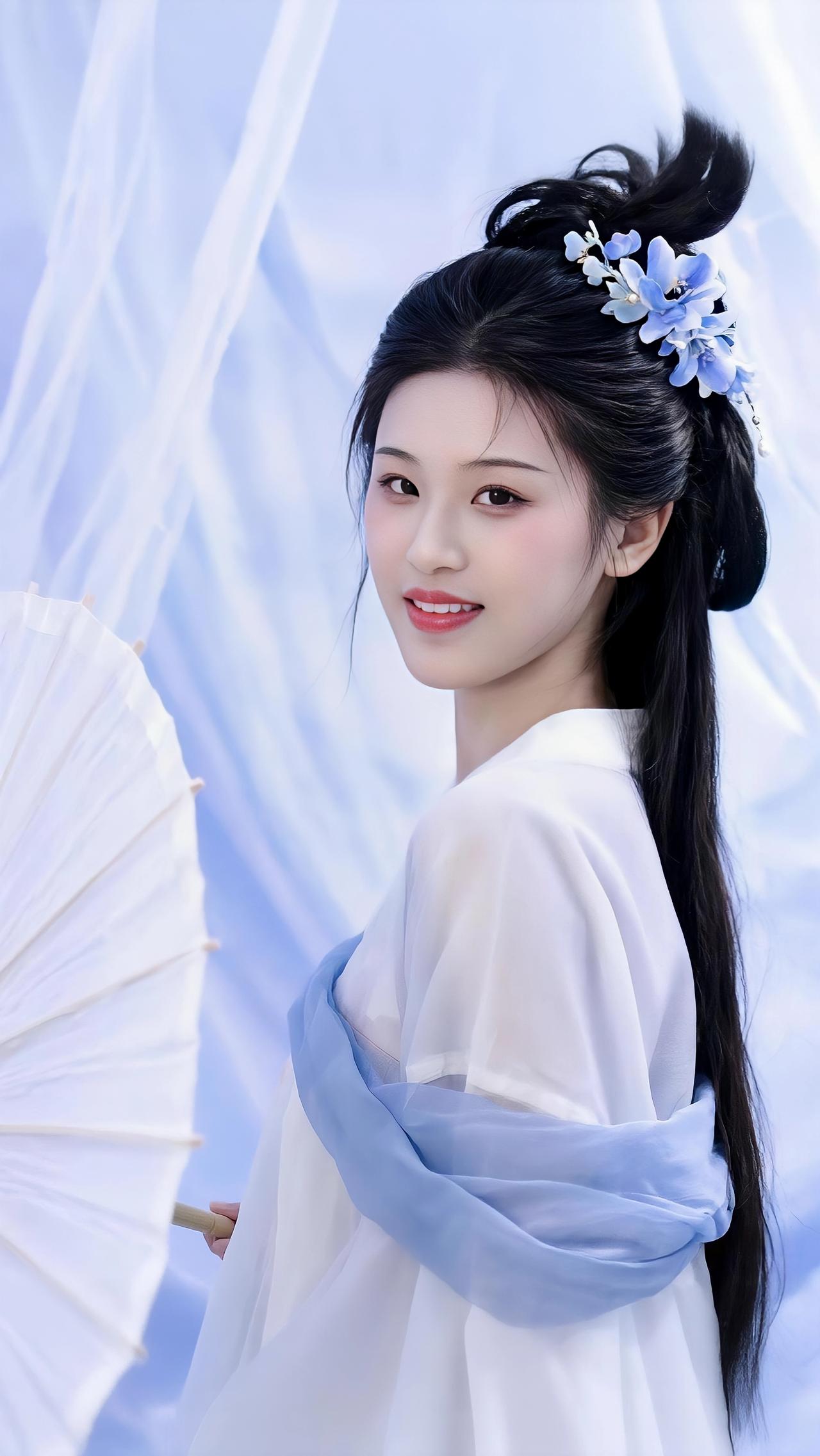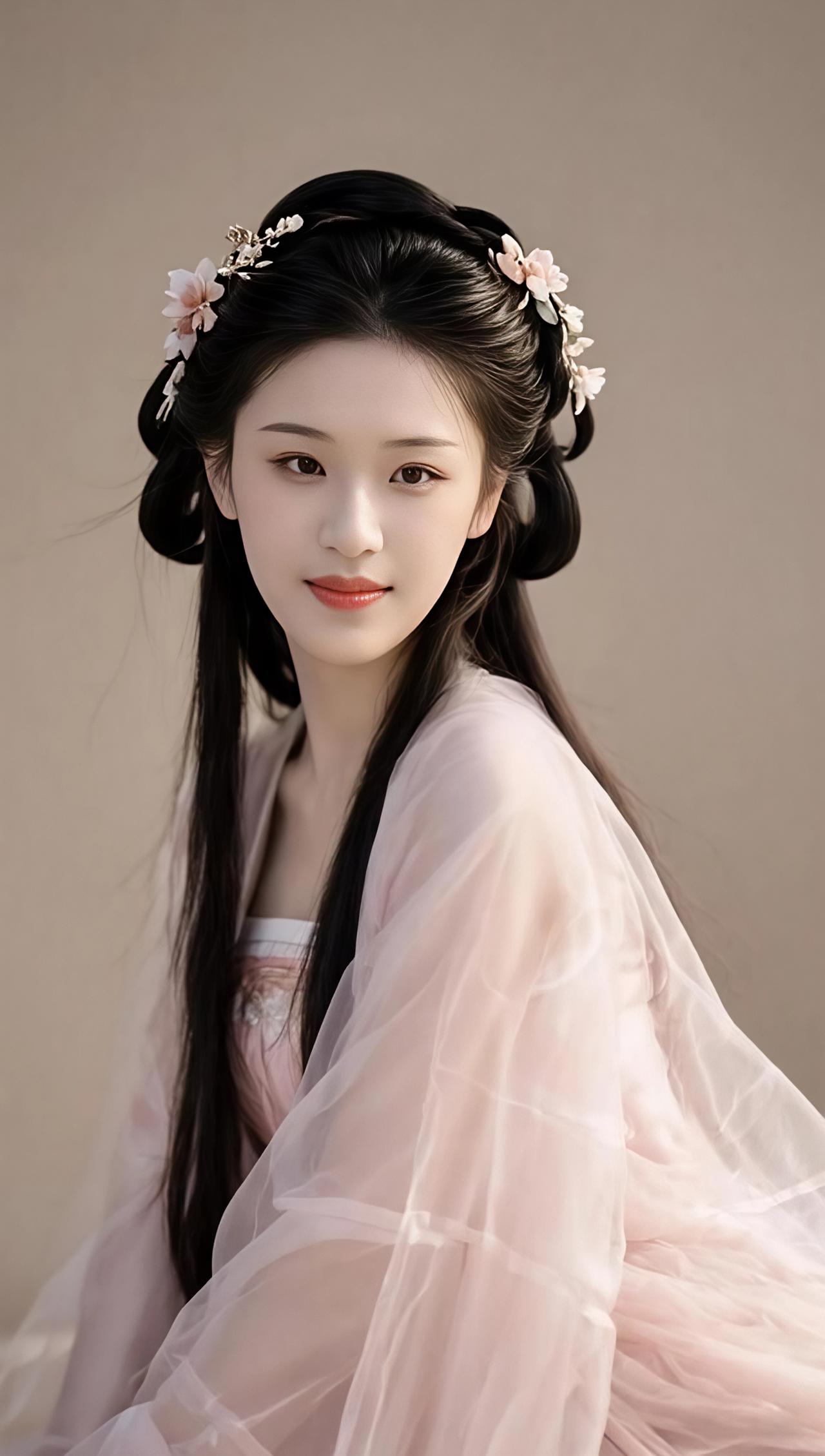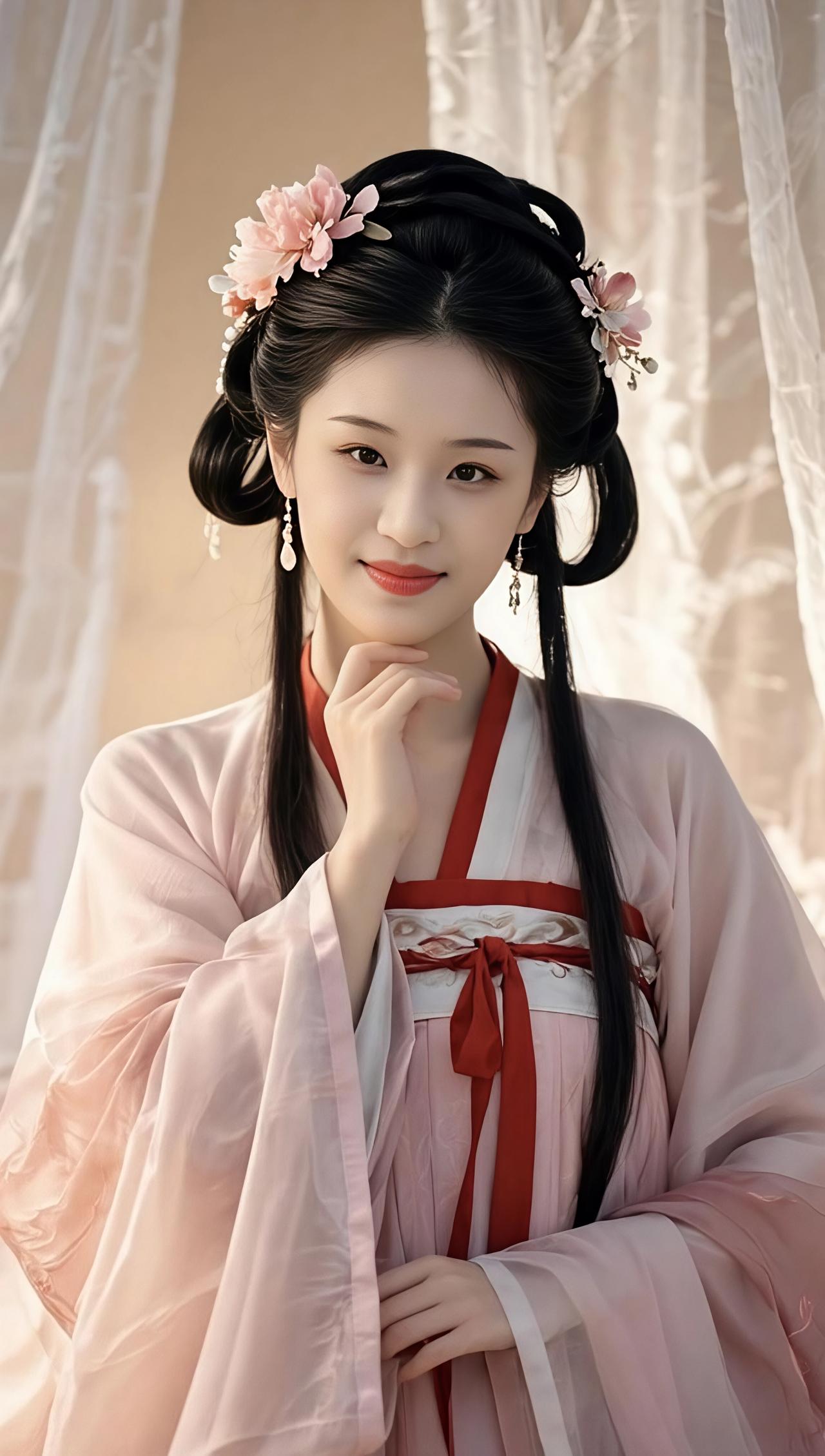 林光初透晓烟轻,翠袂红绦立晓晴。 云鬓簪花凝露色,春山横黛带柔情。 微抬素手惊鸿起,半转星眸落雁停。 莫道仙娥天上有,人间初见已倾城。 绿裳古风照 晨雾漫过林梢 你是一片青瓷,被风轻轻托举 红带是釉色里跳脱的朱砂 在薄如蝉翼的翠色里流淌 发间的银饰垂着细碎的光 像晨露刚吻过海棠 你抬手的弧度,是云舒展的模样 目光流转时,山风也为你停了半晌 不必问仙乡何处 此刻,你就是雾色里最温柔的具象