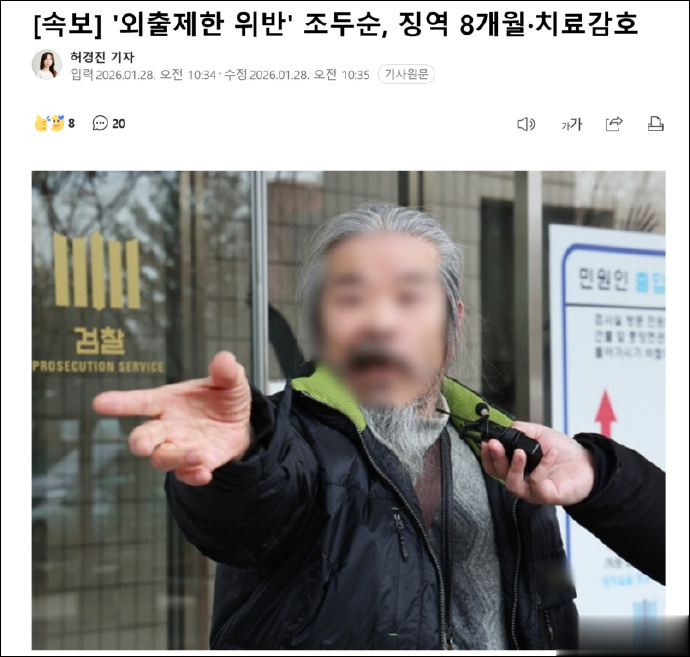 据韩媒,《素媛》案儿童性犯罪者赵斗顺,因涉嫌多次在上下学时段无正当理由违反外出限制令等而被起诉,被法院判处有期徒刑8个月,同时下达监护治疗处分,宣判后立即签发逮捕令。