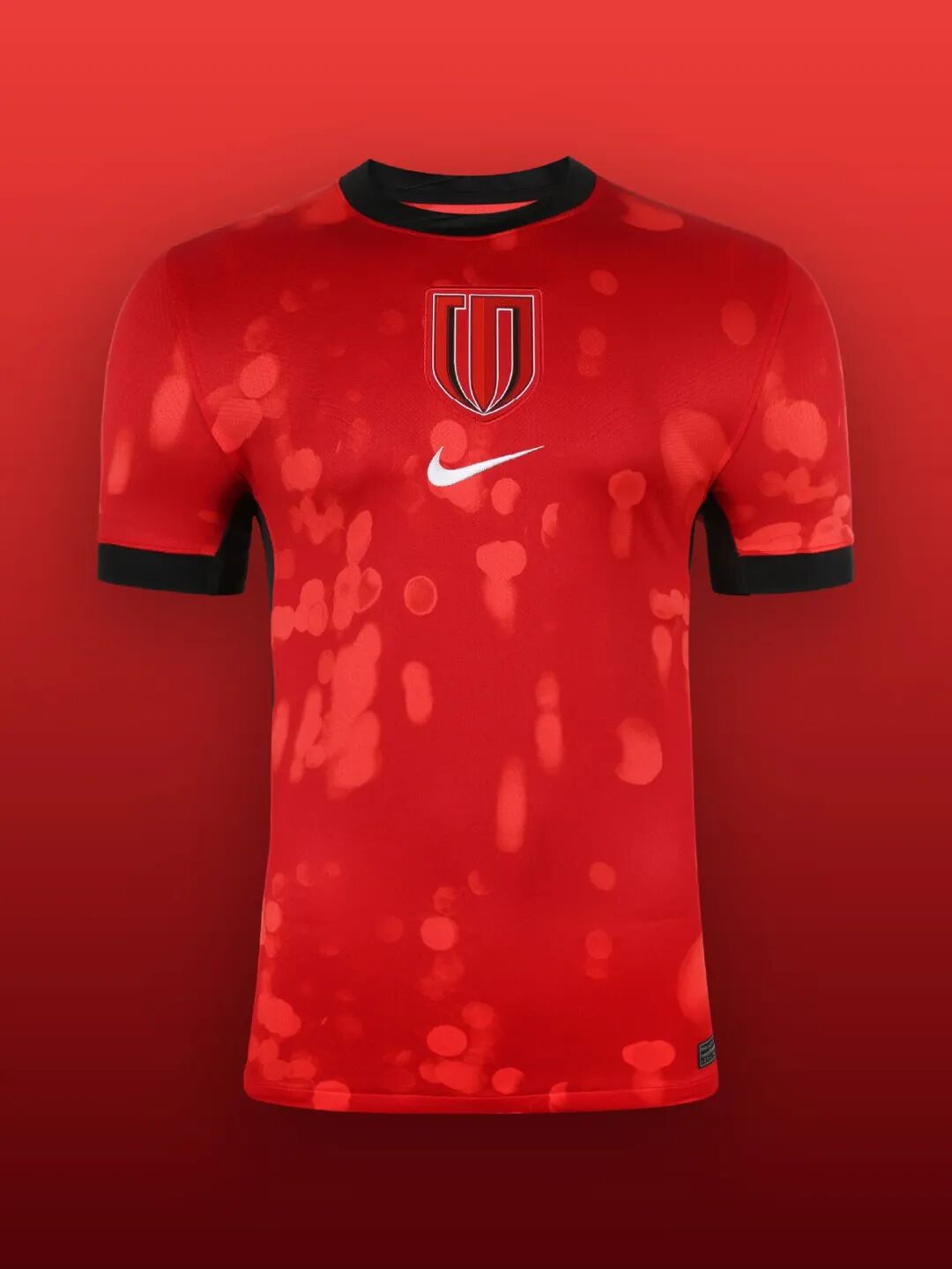 新赛季成都蓉城主场球衣以城市夜色为灵感,整体以红色为主,辅以黑色细节点缀,将流动的光影转化为遍布全身的虚化光斑图案,营造出动态视觉效果。