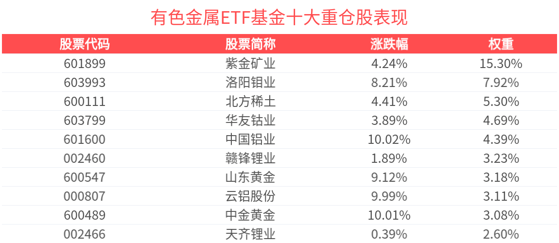 有色金属ETF基金紧密跟踪中证细分有色金属产业主题指数,截至2025年12月31日,中证细分有色金属产业主题指数(000811)前十大权重股分别为紫金矿业、洛阳钼业、北方稀土、华友钴业、中国铝业、赣锋锂业、山东黄金、云铝股份、中金黄金、天齐锂业,前十大权重股合计占比52.98%。(以上所列股票仅为指数成份股,无特定推荐之意)