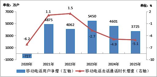 2025年,全国移动短信业务量23020亿条,比上年增长14.2%,移动短信业务收入比上年下降2.4%。全国移动电话去话通话时长2.02万亿分钟,比上年下降5.1%。
