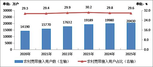固定互联网宽带接入服务持续在农村地区加快普及,截至2025年底,全国农村宽带用户总数达2.04亿户,全年净增450.7万户。
