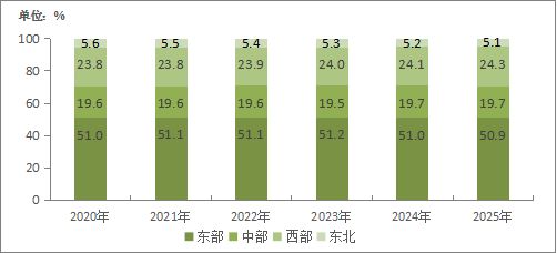 图5-12020—2025年东、中、西、东北部地区电信业务收入比重