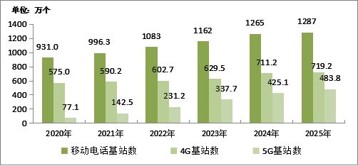 截至2025年底,全国移动电话基站总数达1287万个,比上年末净增22.7万个。其中,4G基站为719.2万个,比上年末净增8万个。5G基站为483.8万个,比上年末净增58.8万个,5G基站占移动电话基站总数达37.6%,占比较上年末提升4个百分点。其中,具备5GRedCap接入能力的基站数达206.4万个,占5G基站的42.7%。