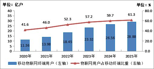 截至2025年底,中国电信、中国移动和中国联通三家基础电信企业发展移动物联网终端用户28.88亿户,全年净增2.32亿户,超过移动电话用户数10.61亿户,占移动网终端连接数的比重达61.3%。