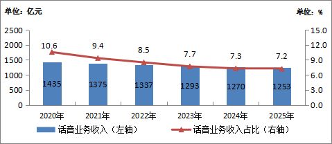 2025年,完成固定语音和移动语音业务收入160.9亿元和1092亿元,比上年分别增长2.3%和下降1.7%,两项业务合计占电信业务收入的7.2%,占比较上年回落0.1个百分点。