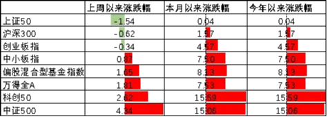 上周主要板块震荡上行,其中上证50跌1.54%,跌幅最大;中证500涨4.34%,涨幅最大。国内市场情绪较强,A股维持上行趋势。偏股基金指数涨1.65%。