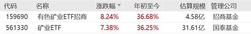 有色金属板块今日掀涨停潮,白银有色、中国铝业、铜陵有色、中金黄金、北方铜业、湖南黄金、云南铜业、西部黄金、云铝股份等多股大涨。有色矿业ETF招商涨超8%,矿业ETF涨超7%,年内涨幅超36%。