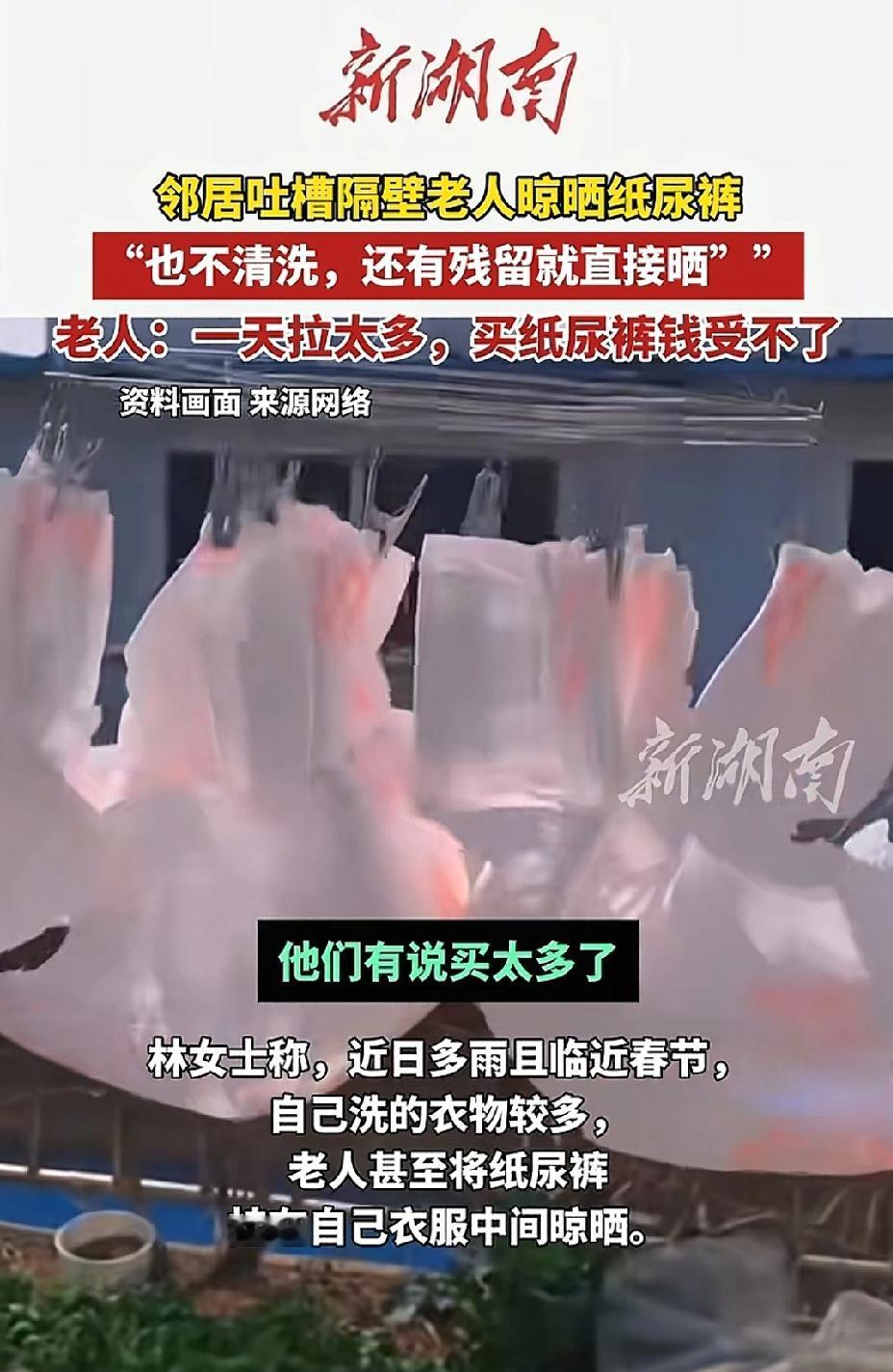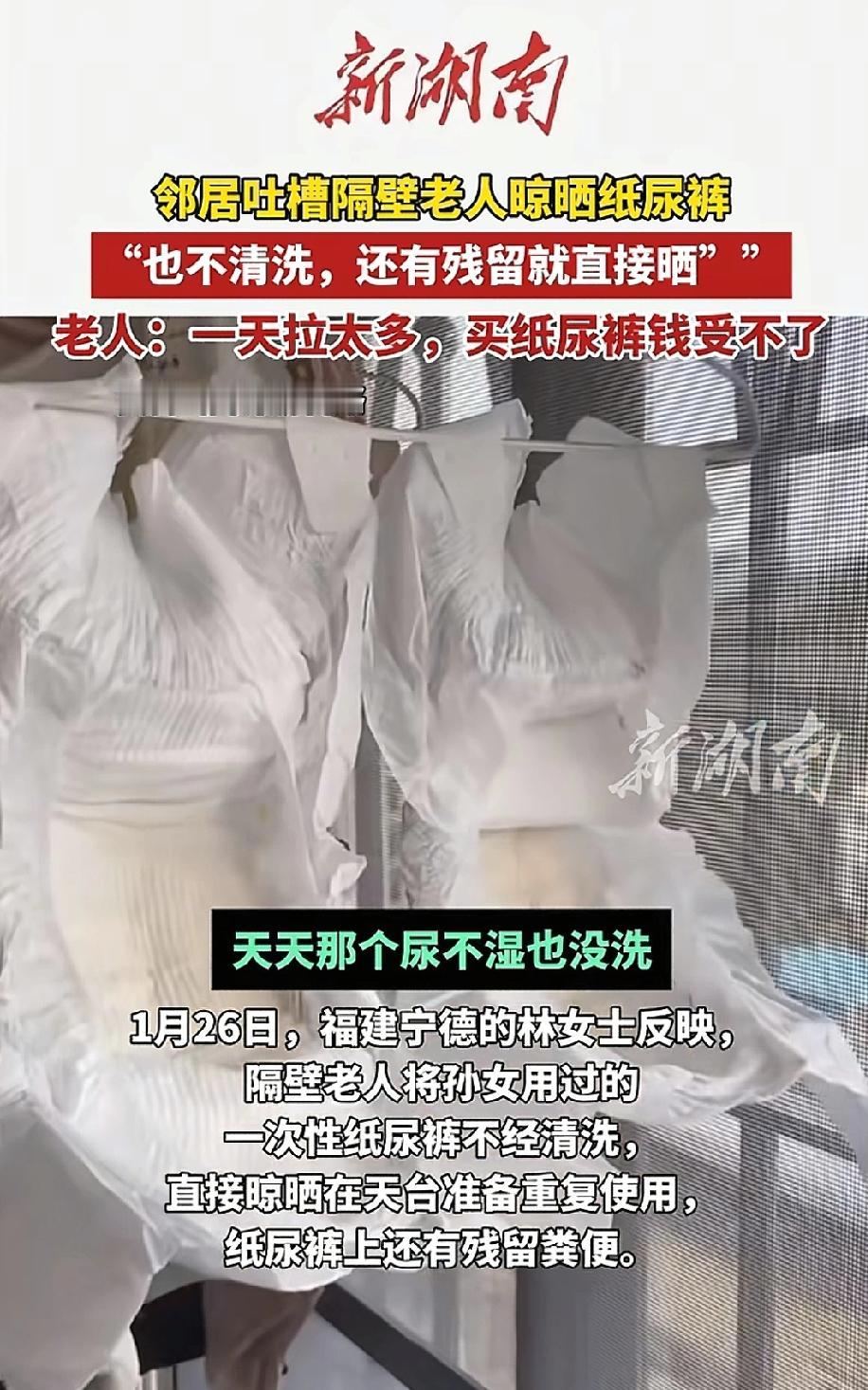 福建,老人嫌孙女纸尿裤用的太快又浪费钱,竟然将用过的纸尿裤洗了晒干再次使用。隔壁