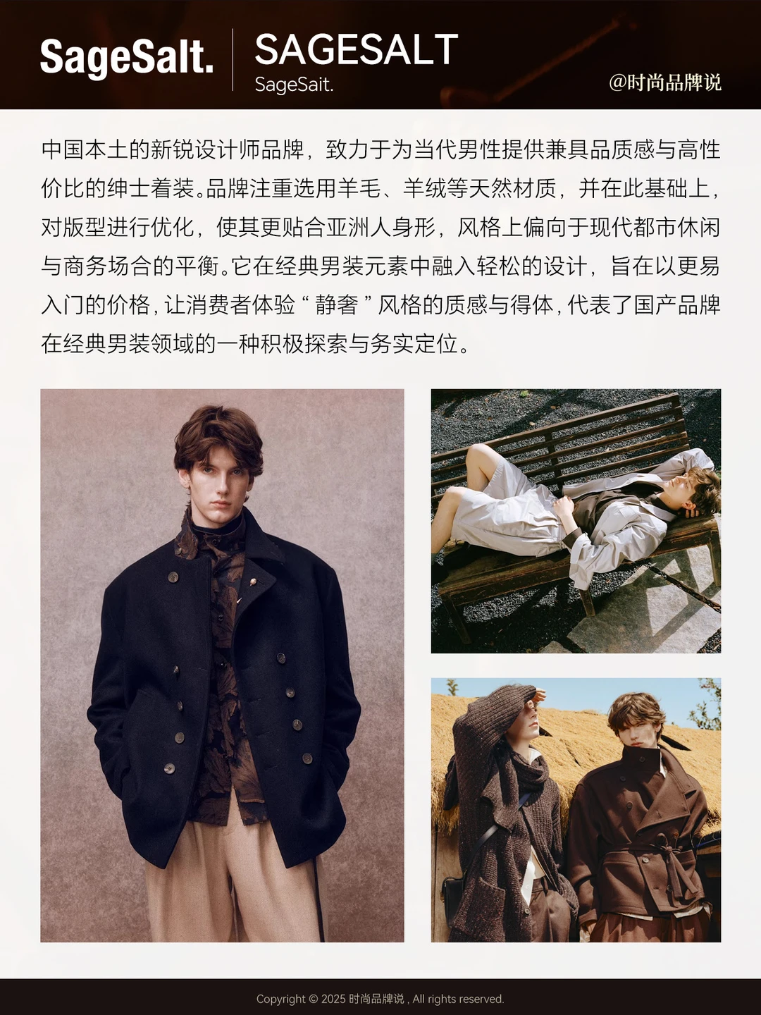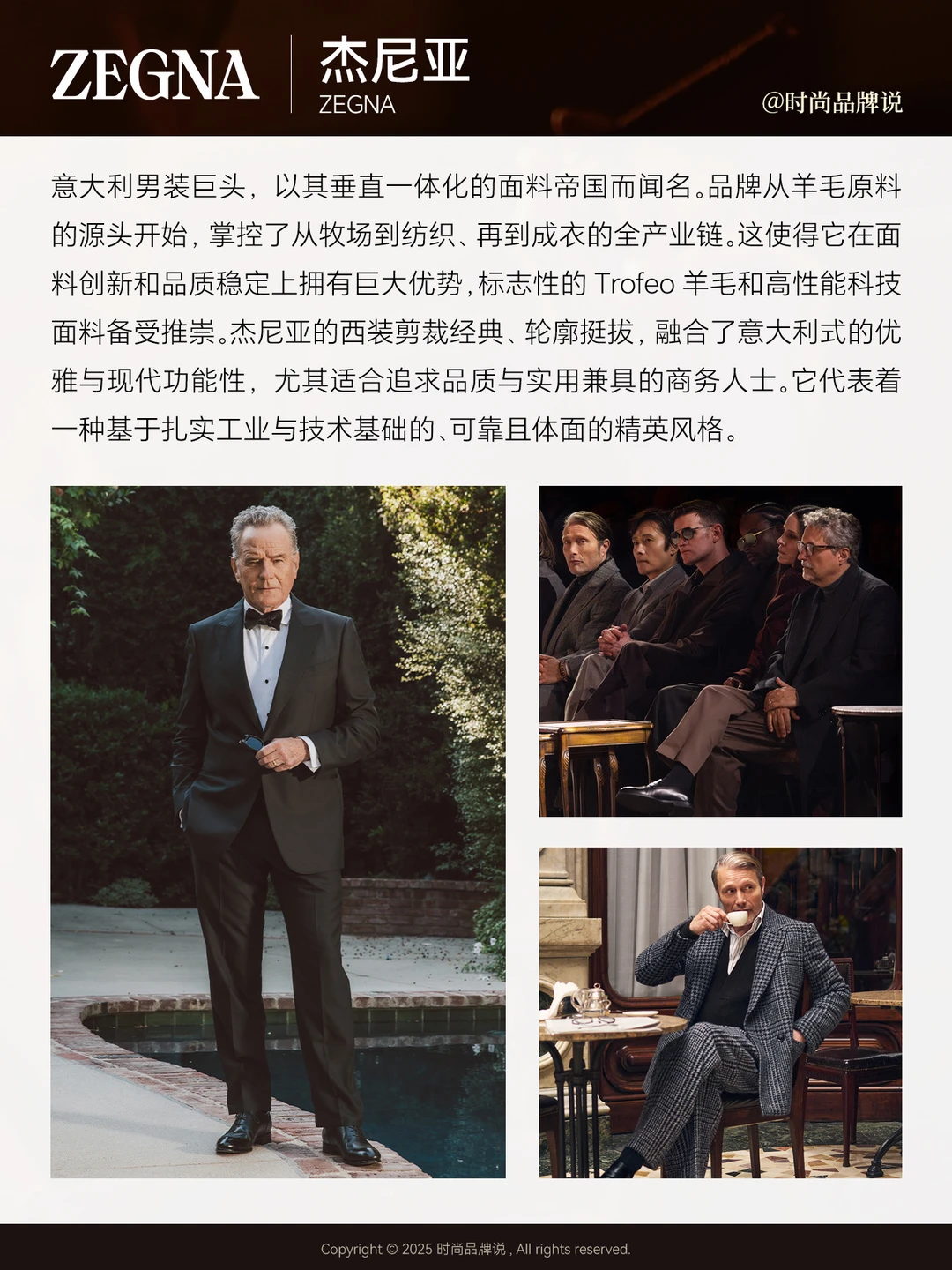 这一梯队拥有鲜明的风格主张与完整的美学体系,定位偏高端成衣与定制结合,强调意式裁缝传统与人文价值,适合商务精英与成熟绅士。